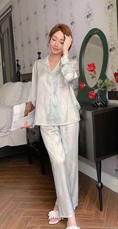 This elegant silky pajamas, available in stunning baby blue colour. This luxurious pajamas provide a soft and smooth texture that feels amazing against the skin. Featuring a classic button-up design with a front pocket and stylish piping details, they offer the perfect balance of comfort and elegance. Whether you’re lounging at home or enjoying a cozy night’s sleep, these pajamas are a must-have. Comes beautifully packaged, making it an ideal gift!