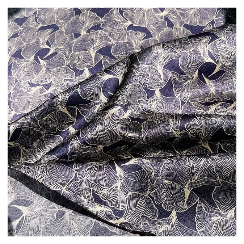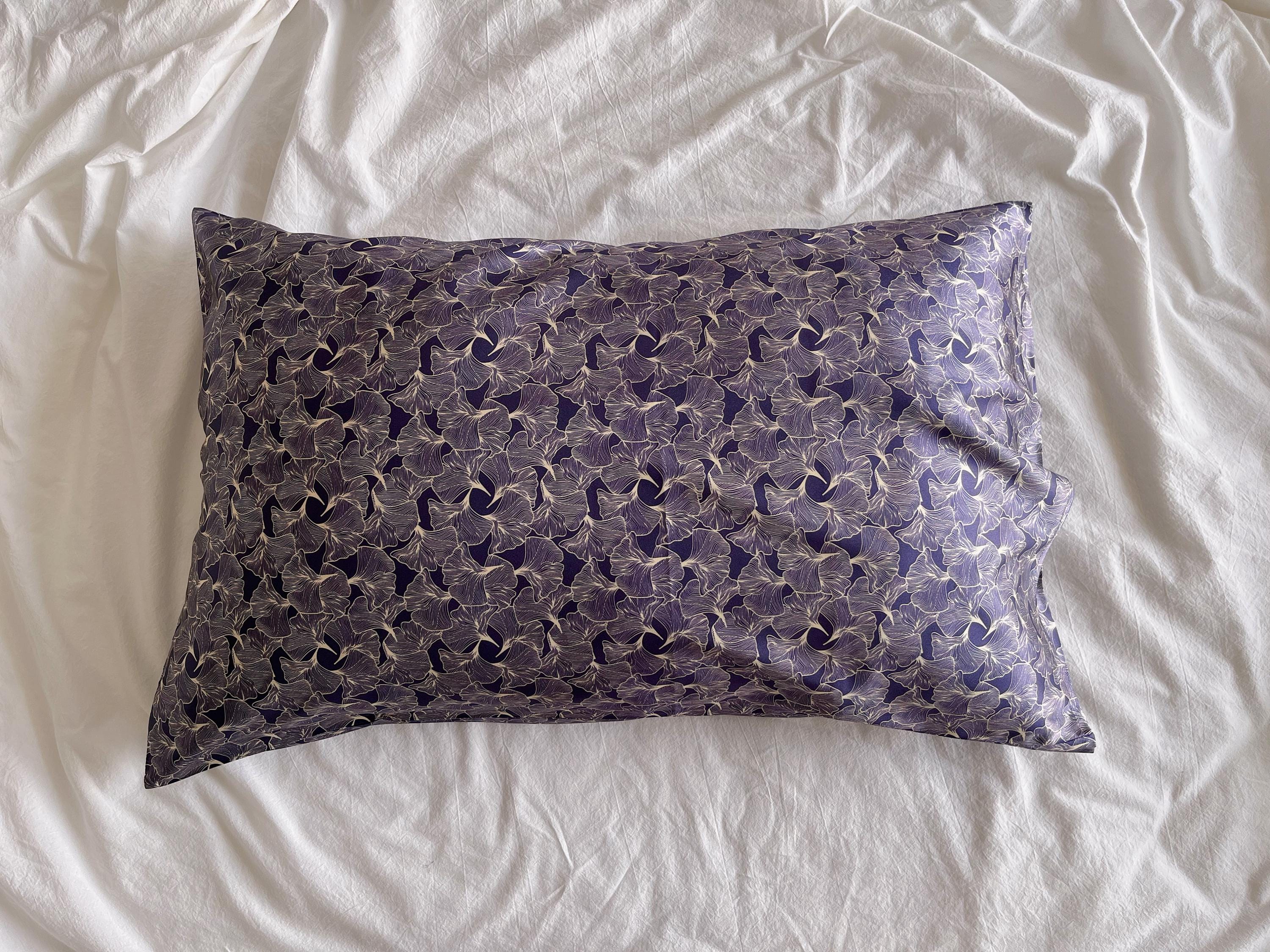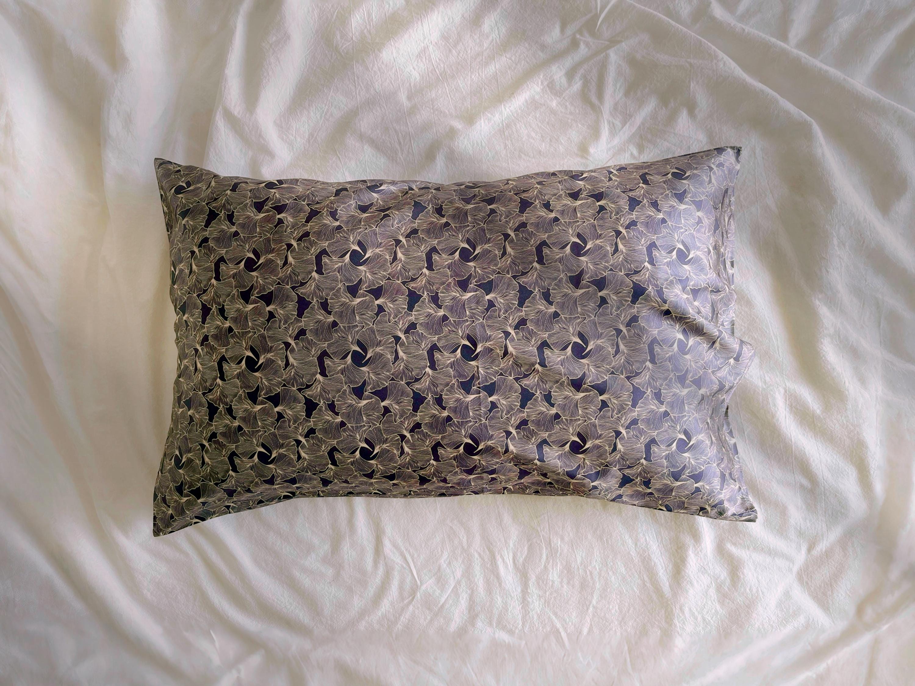 Dark Blue Silk Pillowcase – Silver Ginkgo Leaf Design, 22 Momme