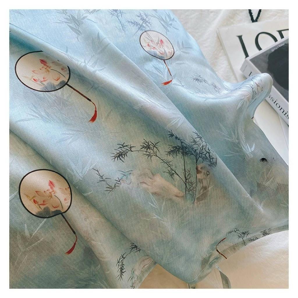 Featuring hand-fan motifs and ink-style bamboo landscape on a sky blue base, the design blends classic Chinese elements with modern simplicity for a calming, elegant look.