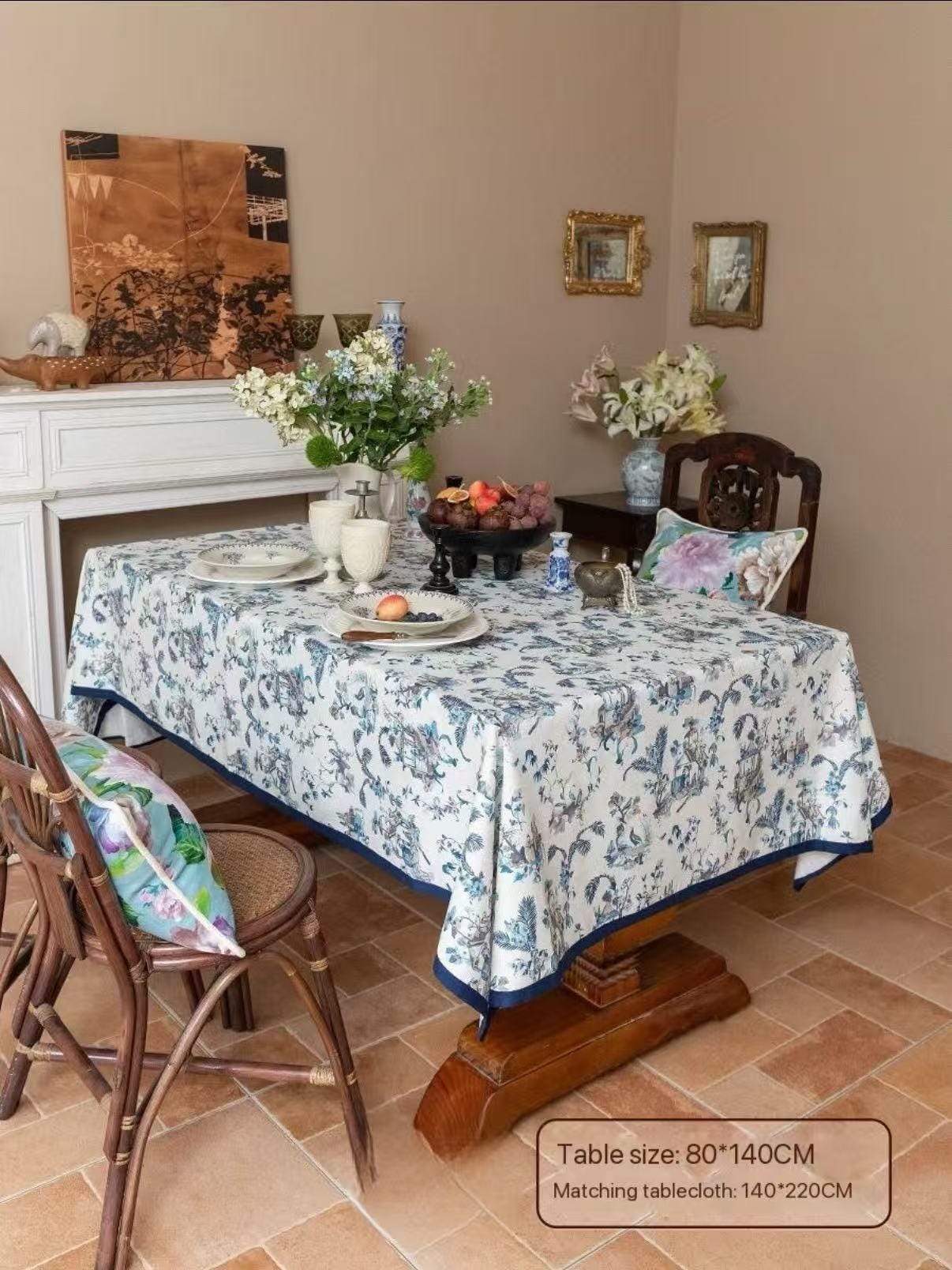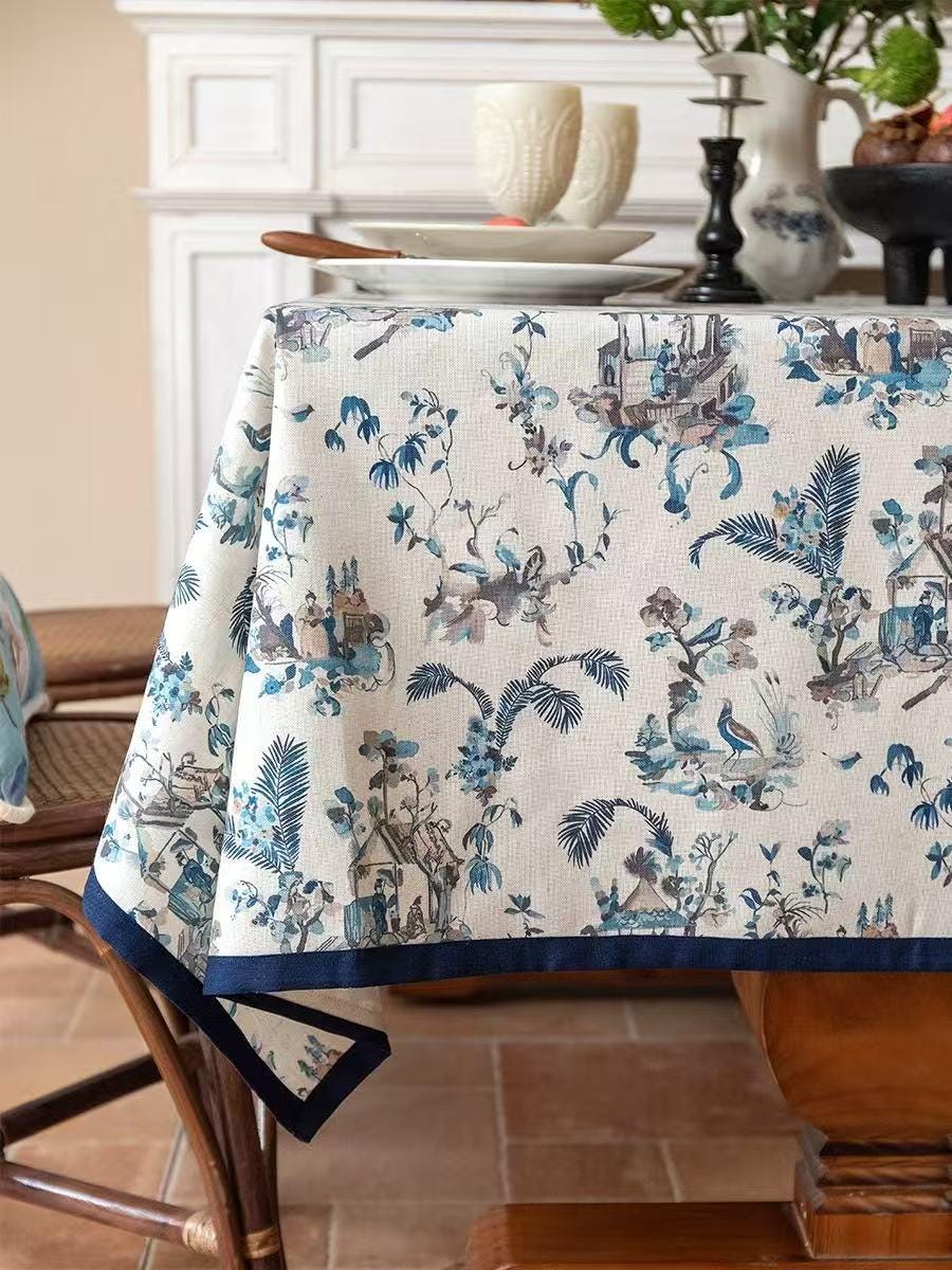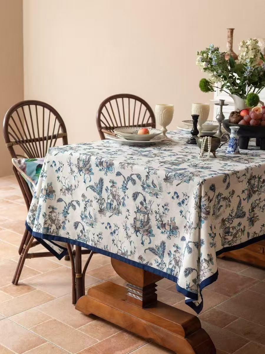 This tablecloth captures the charm of Chinese painting, with delicate birds, pagodas, and landscape motifs rendered in soft brushstroke style. An elegant piece for dining tables, it adds cultural sophistication to everyday meals and festive gatherings alike.