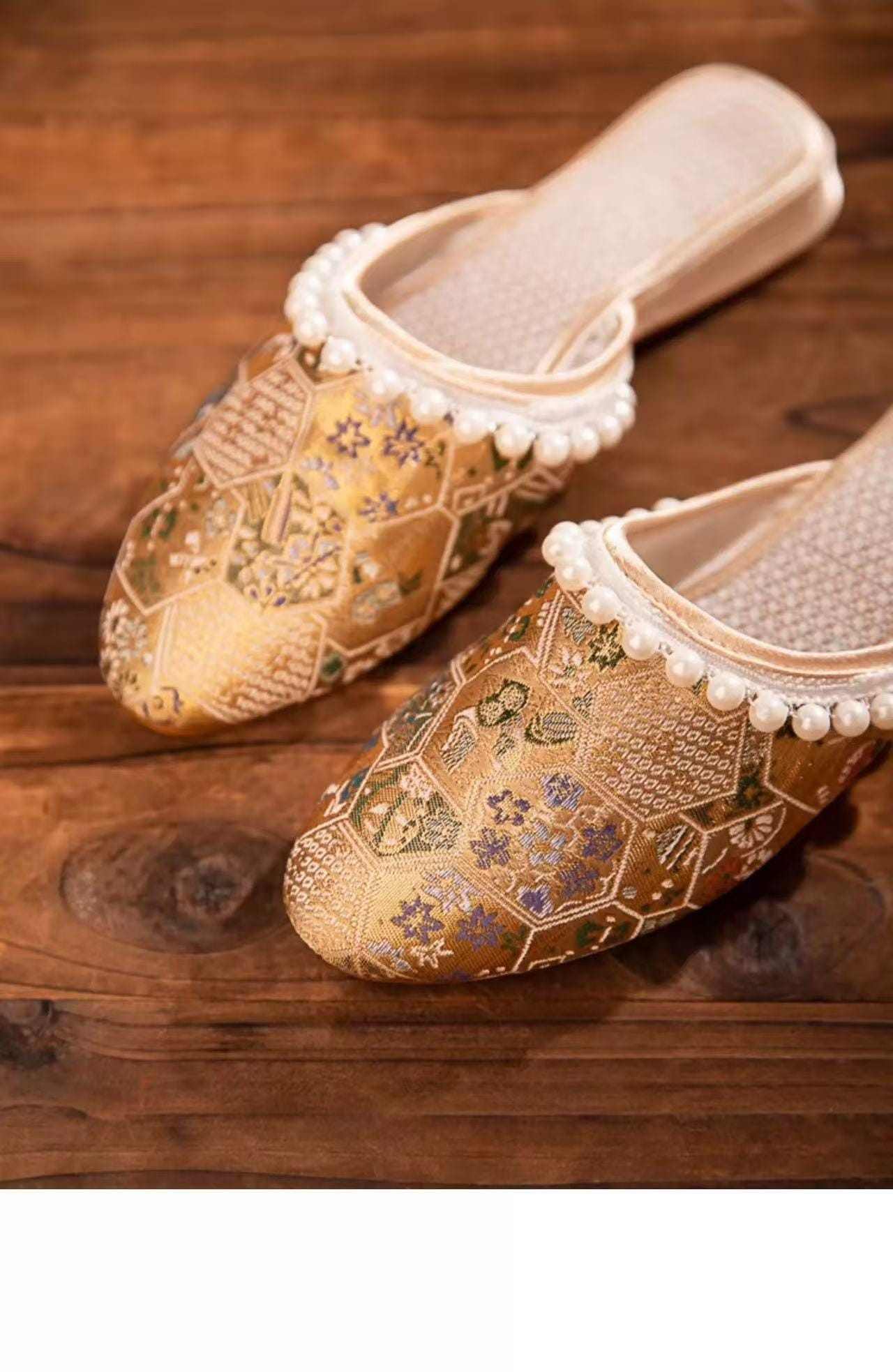 ✨ Grace your steps with elegance in these pearl-trimmed oriental brocade mules. Designed with intricate jacquard patterns inspired by traditional Eastern textiles, this pair blends timeless heritage with modern comfort.