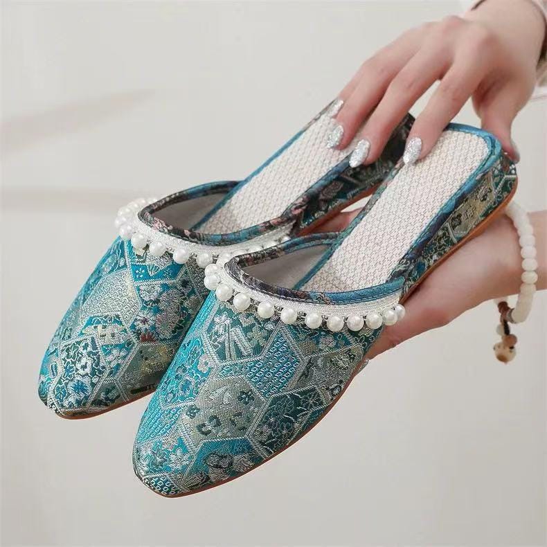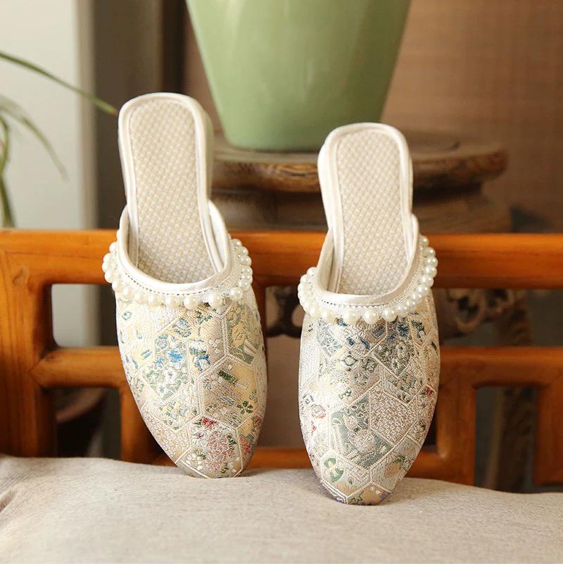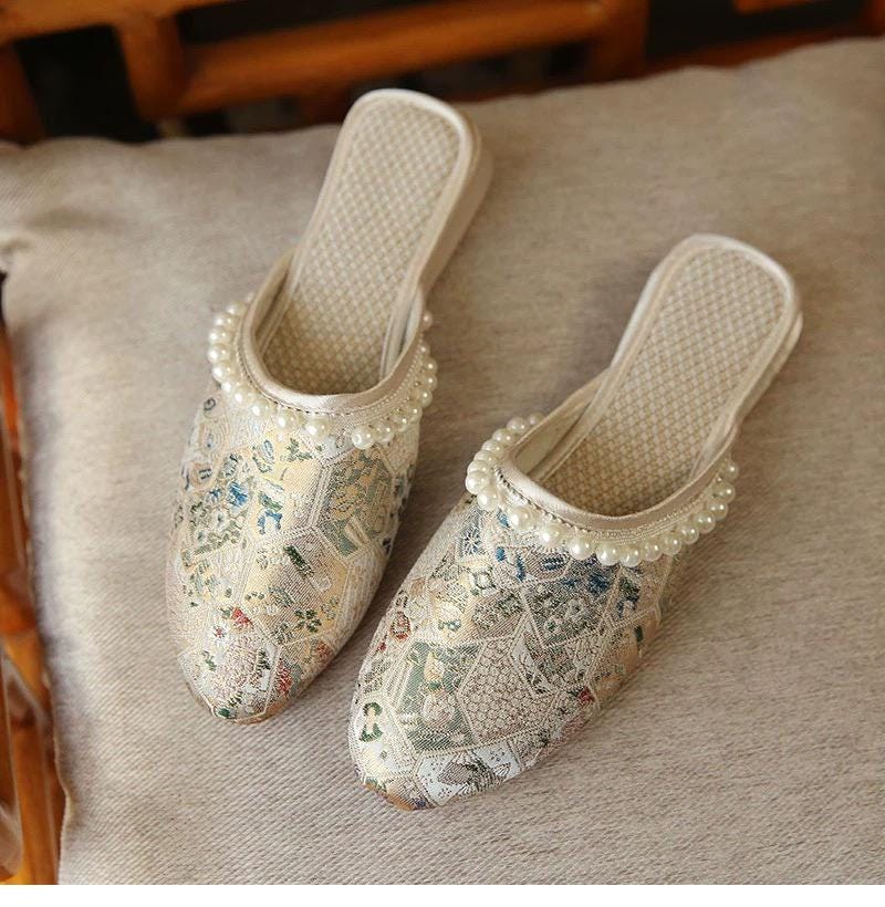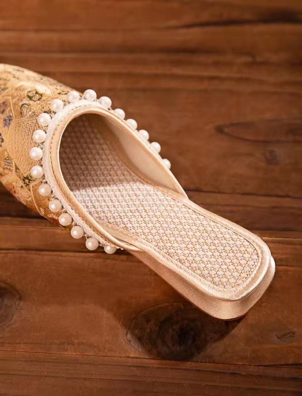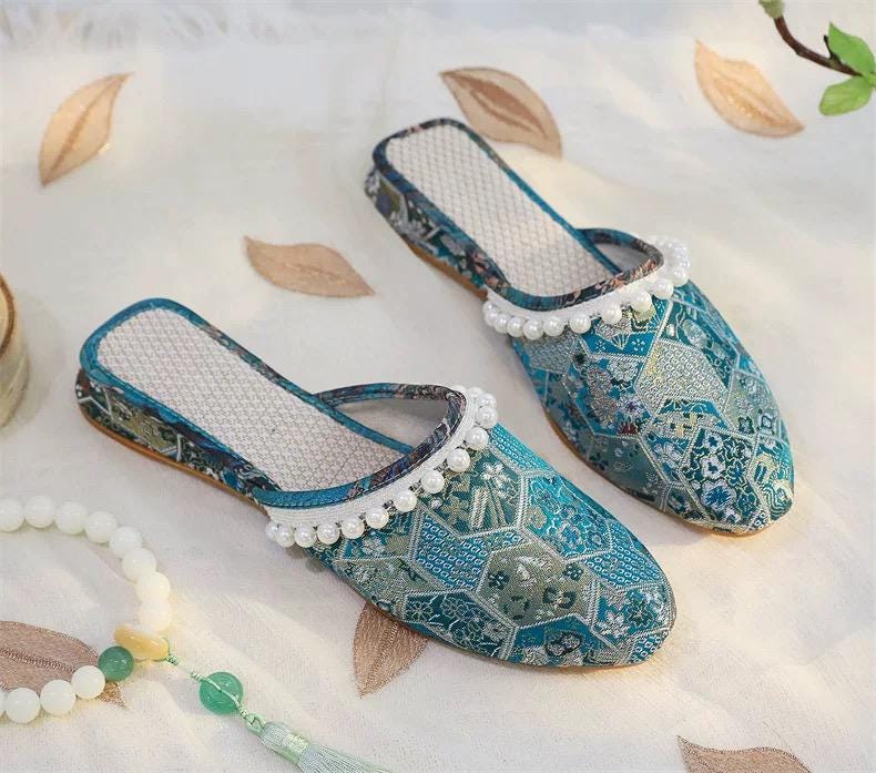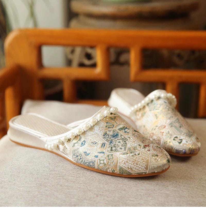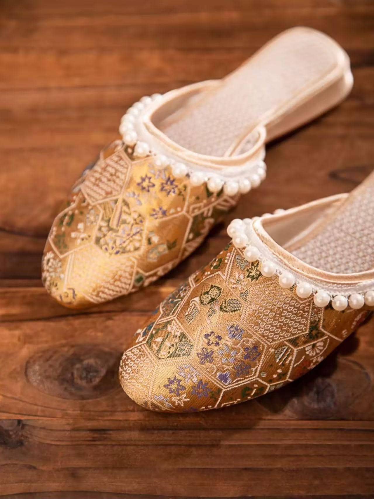 ✨ Grace your steps with elegance in these pearl-trimmed oriental brocade mules. Designed with intricate jacquard patterns inspired by traditional Eastern textiles, this pair blends timeless heritage with modern comfort.