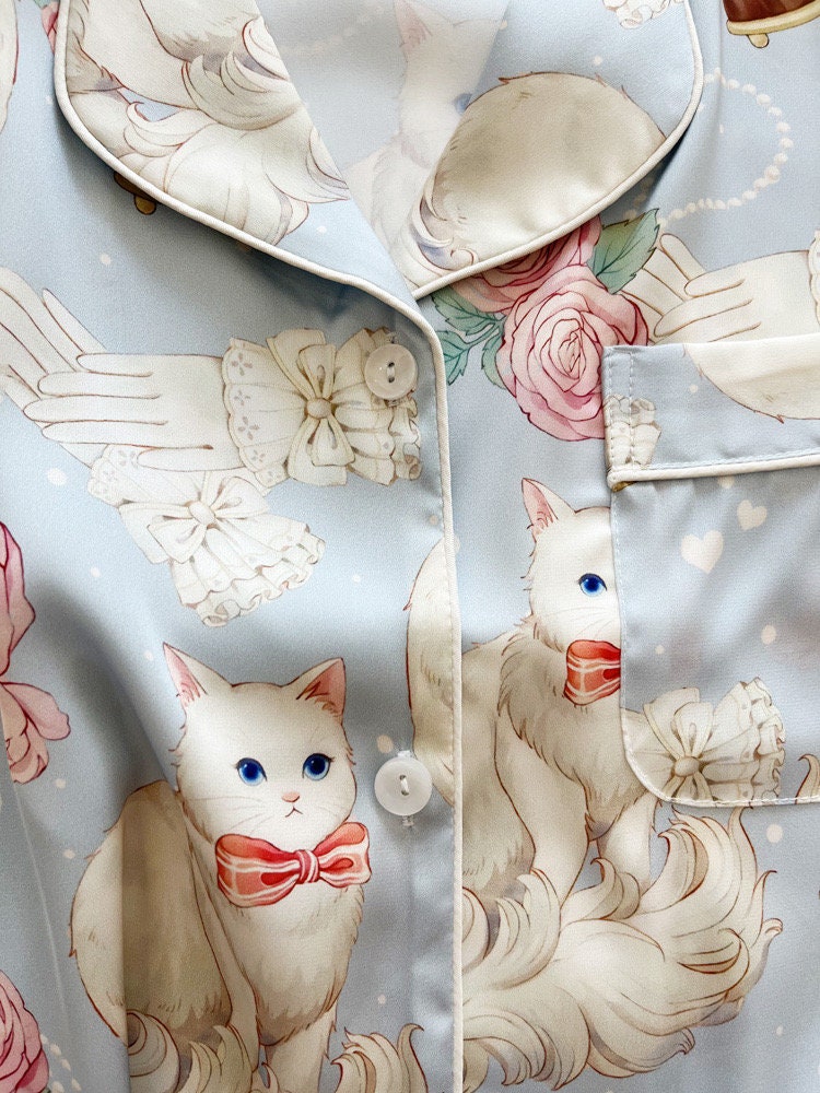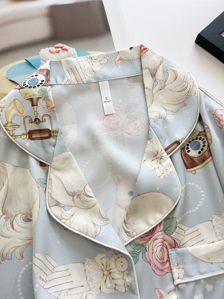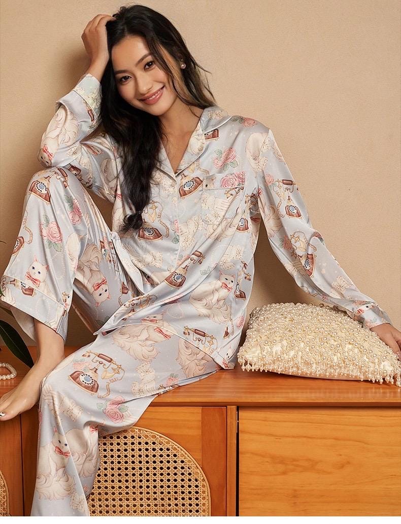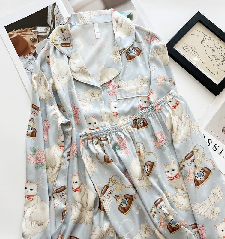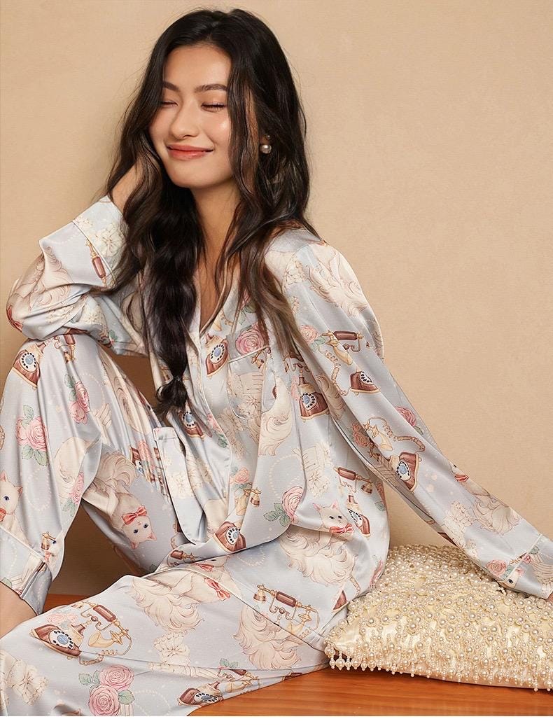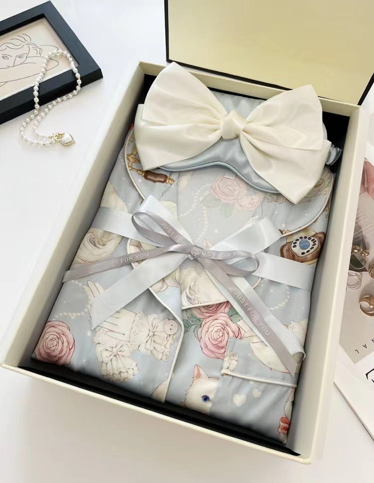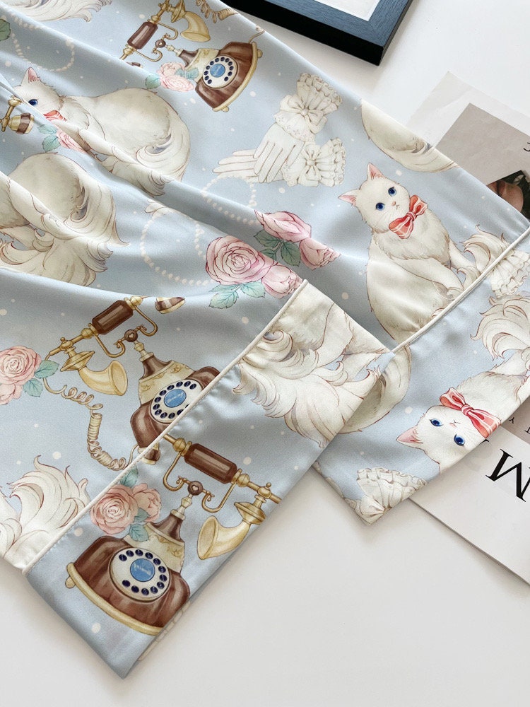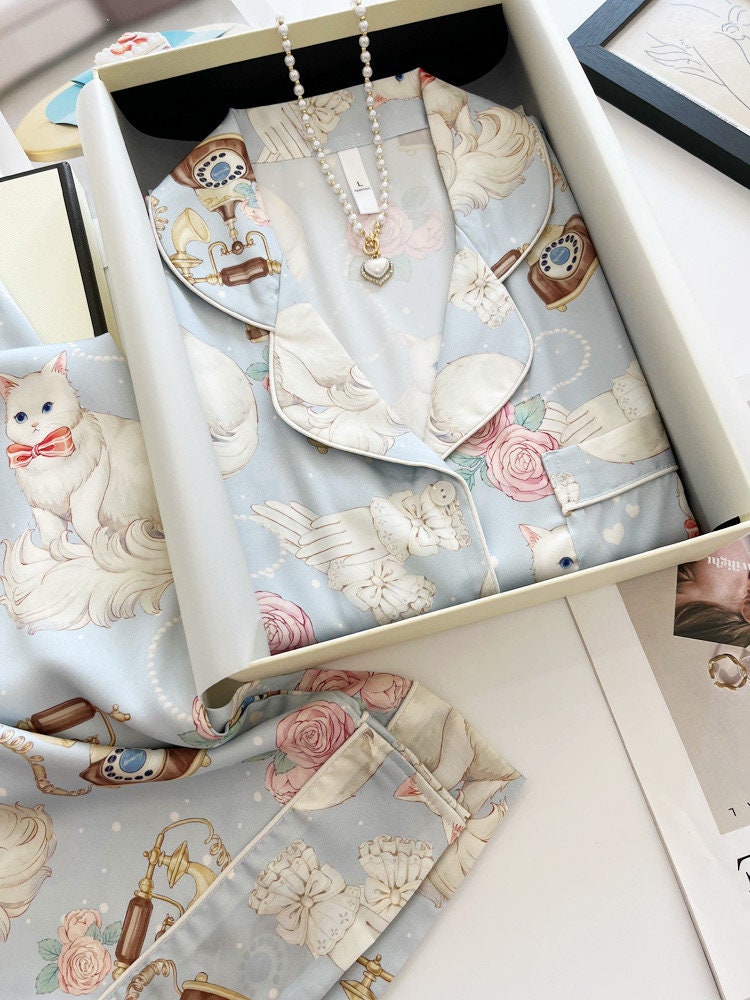 Whether you're treating yourself or looking for a thoughtful gift for a loved one, our Stylish Silk Kitty Pattern Pyjamas Set with Eyemask is sure to delight. Experience the ultimate blend of comfort, style, and cuteness with this chic addition to your sleepwear collection.