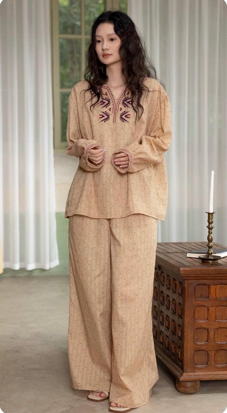 • Design: Embroidered blouse with small V-neck + wide-leg pants with side pockets