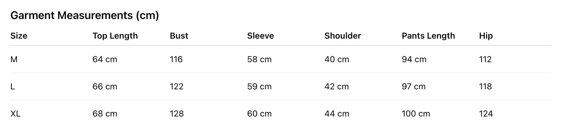 • M: Bust 116 cm, Top Length 64 cm, Sleeve 58 cm, Pants Length 94 cm, Hip 112 cm