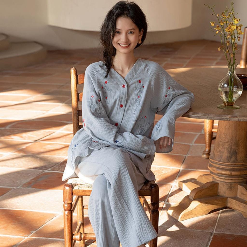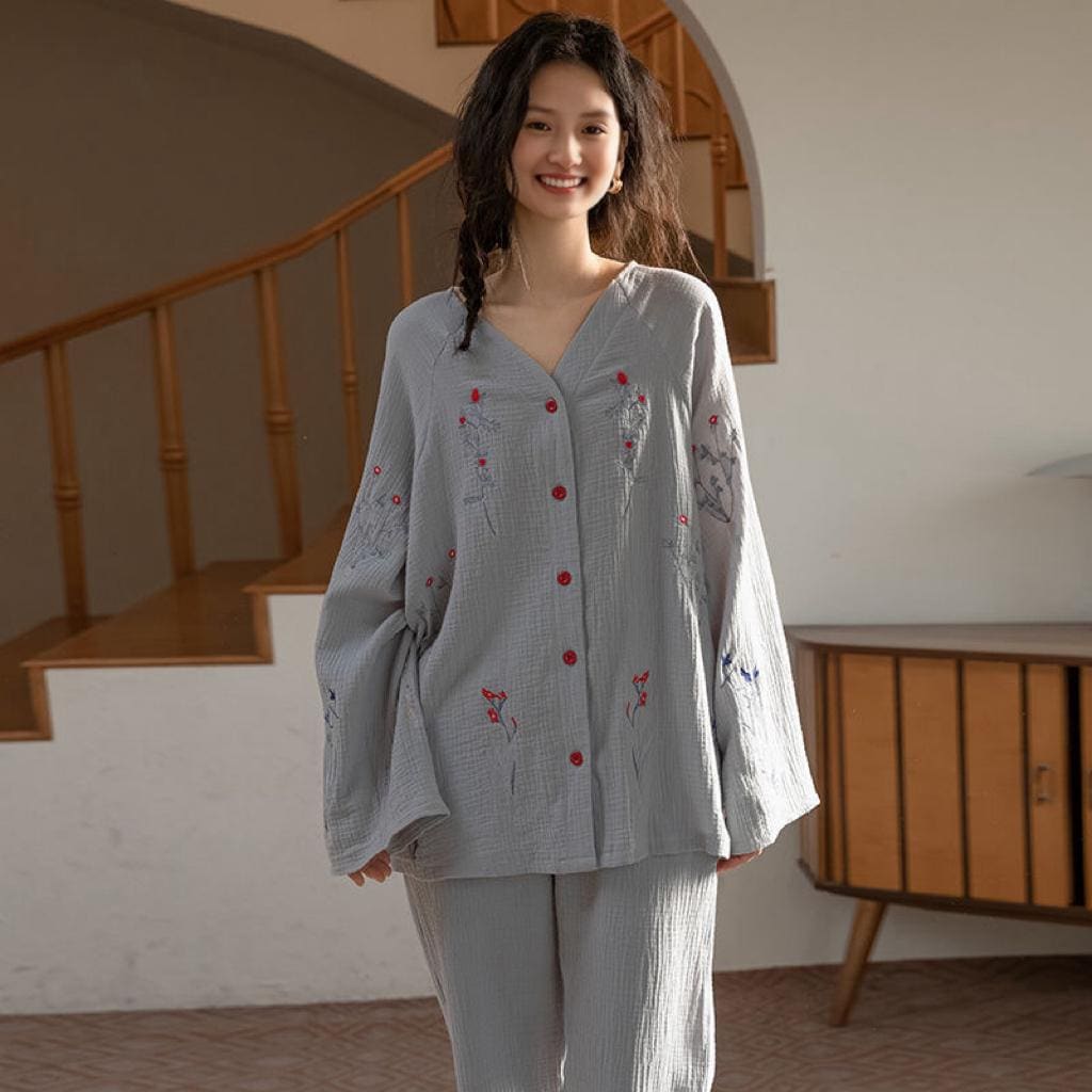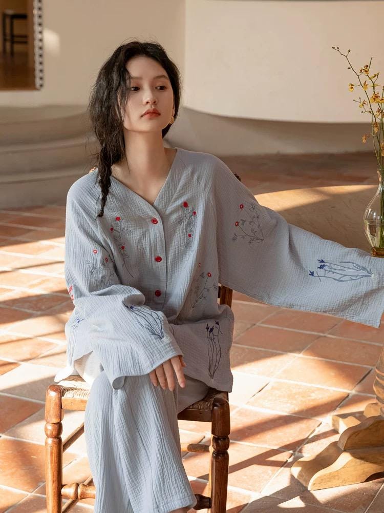 Gauze Cotton Embroidered Pyjama Set – Breathable Oriental-Inspired Loungewear for Women