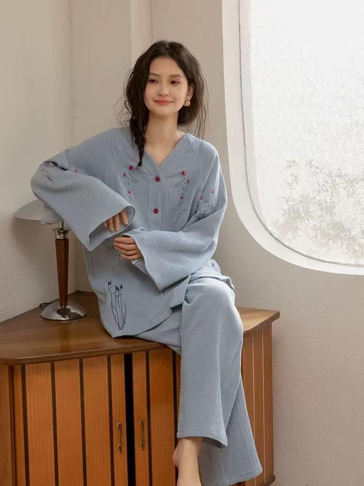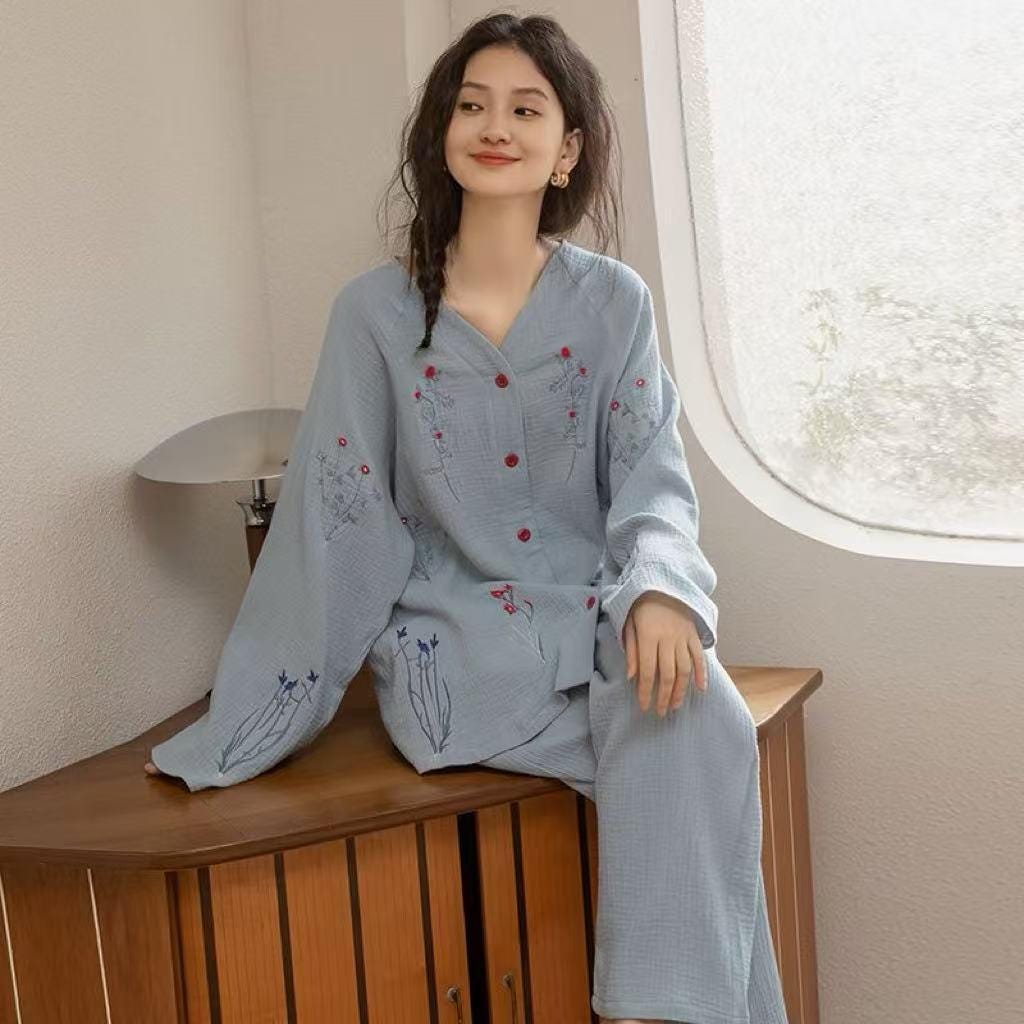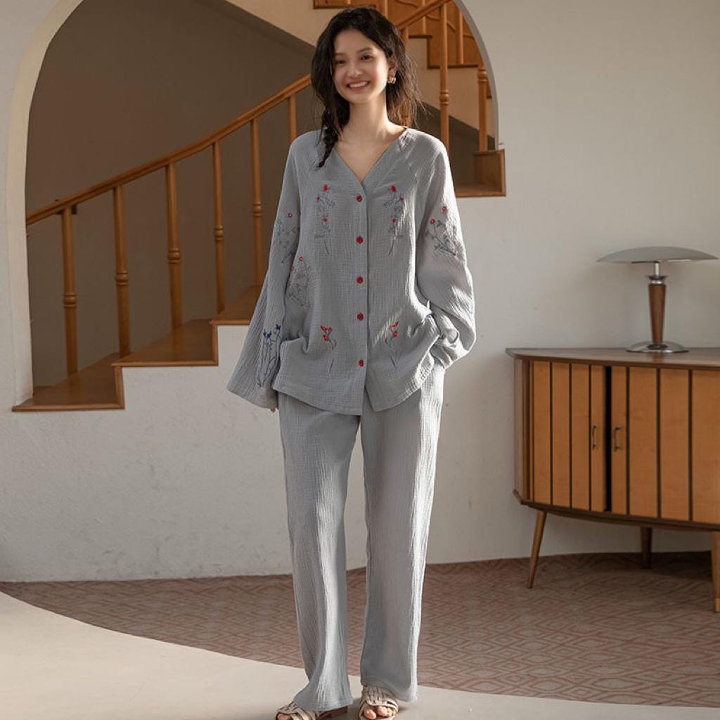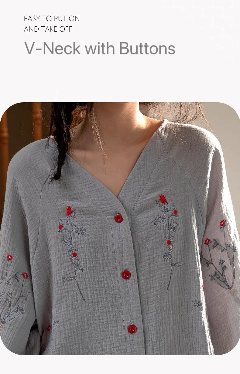 Gauze Cotton Embroidered Pyjama Set – Breathable Oriental-Inspired Loungewear for Women