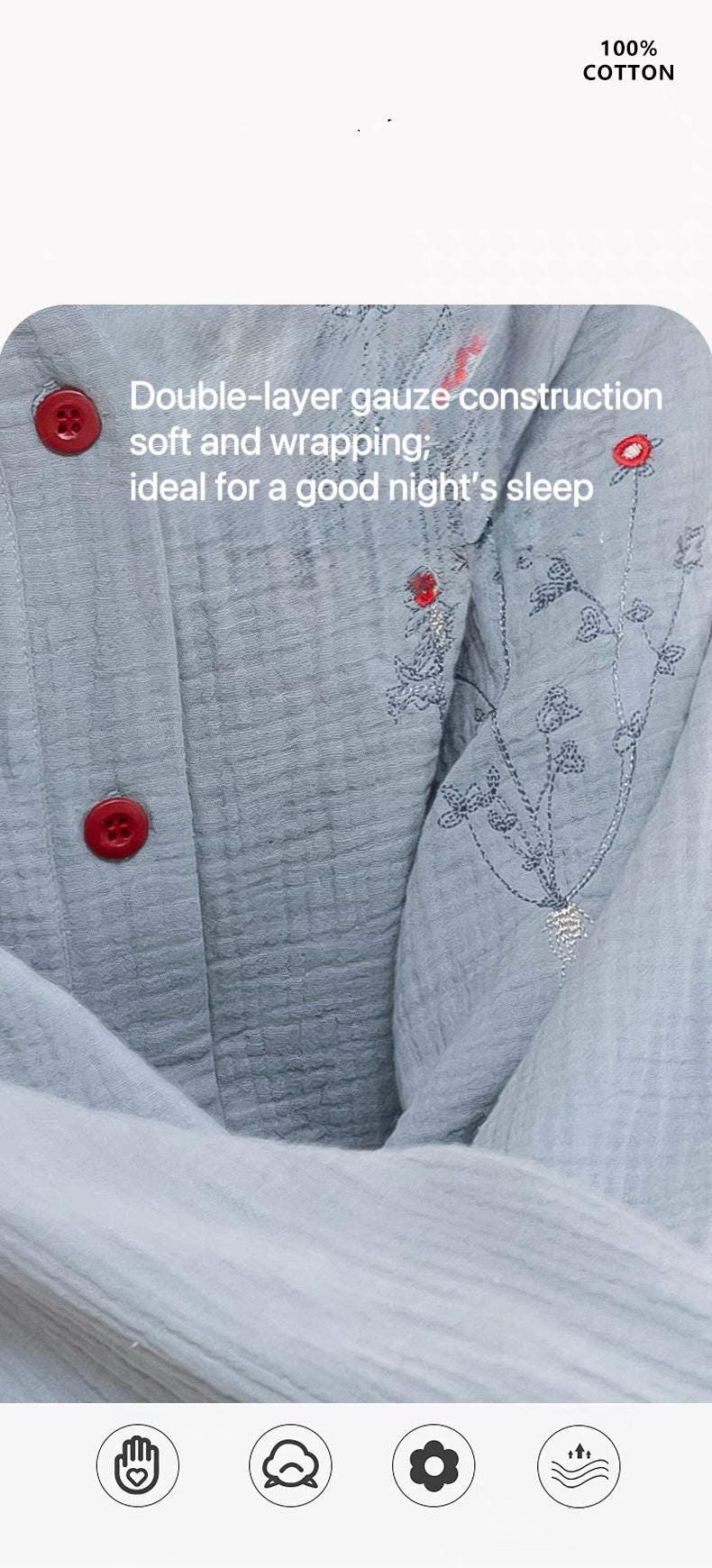 Experience the elegance of oriental-inspired design paired with sustainable functionality. The double-layered gauze cotton offers lightweight warmth and moisture-wicking performance, ideal for sensitive skin. Thoughtful details like red contrast buttons and botanical embroidery elevate the set, while the relaxed silhouette ensures freedom of movement and ease.