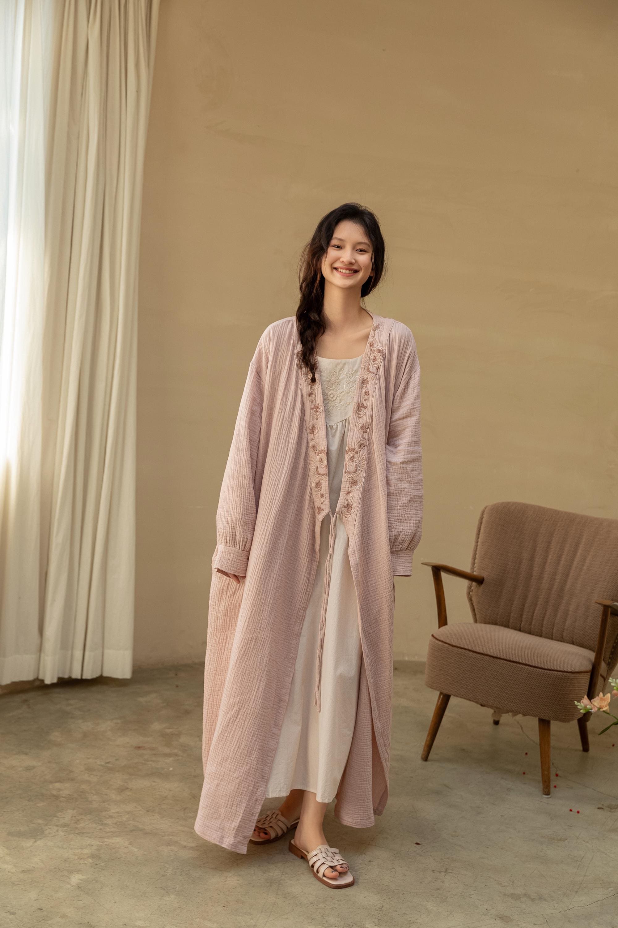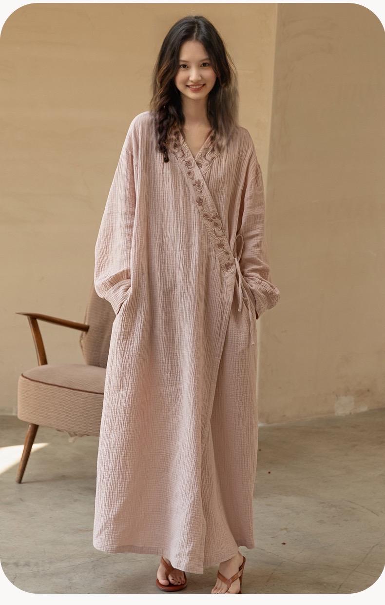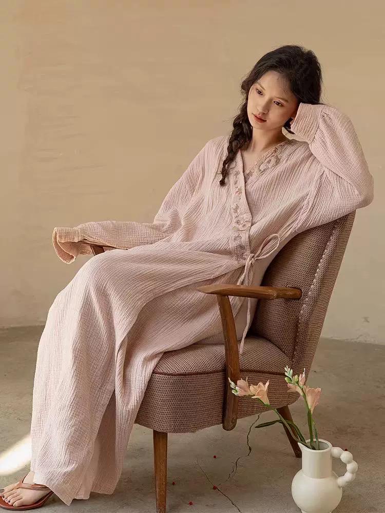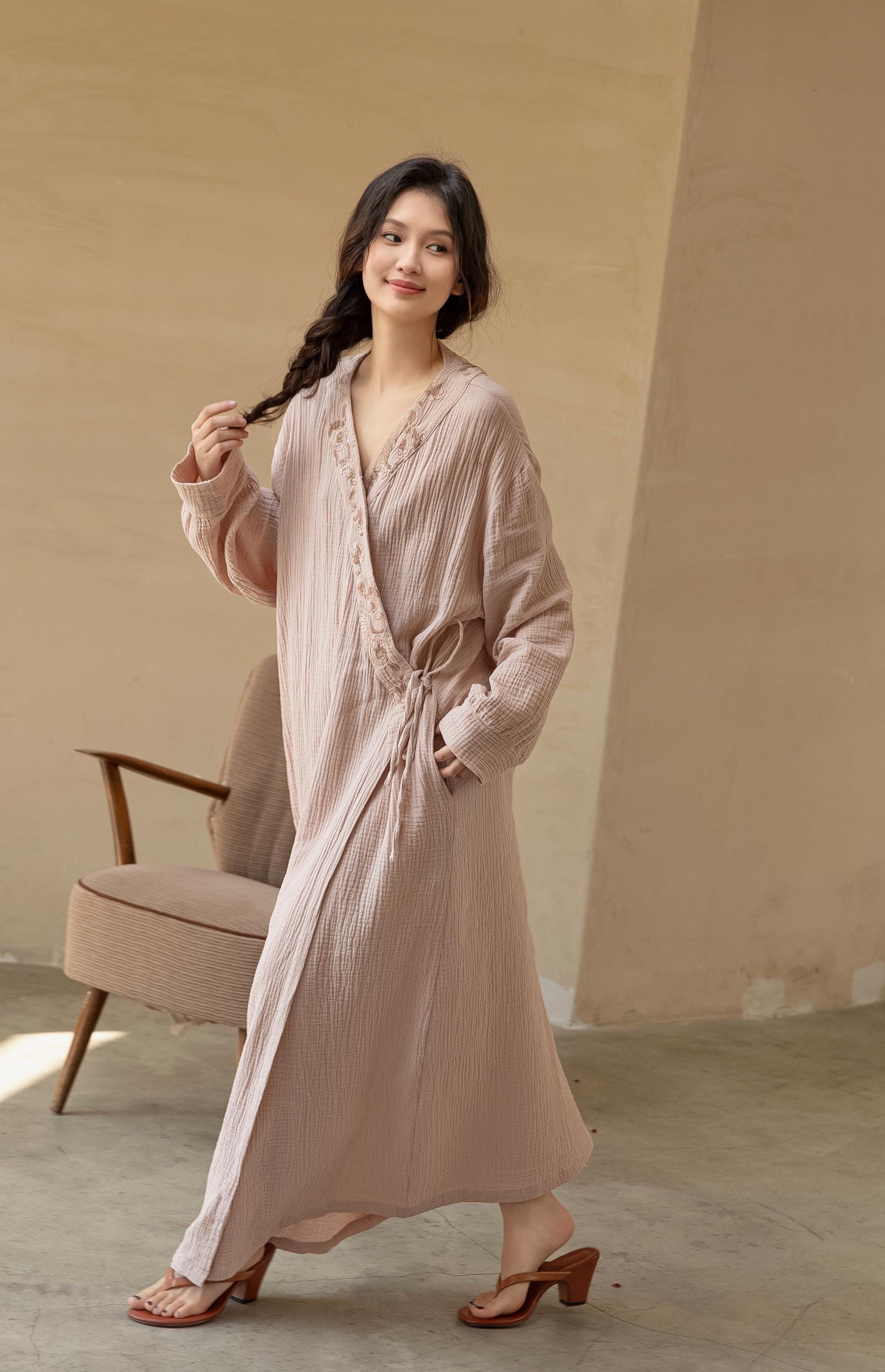 Gauze Cotton Embroidered Robe & Slip Dress Set – Versatile Homewear or Spring Outfit