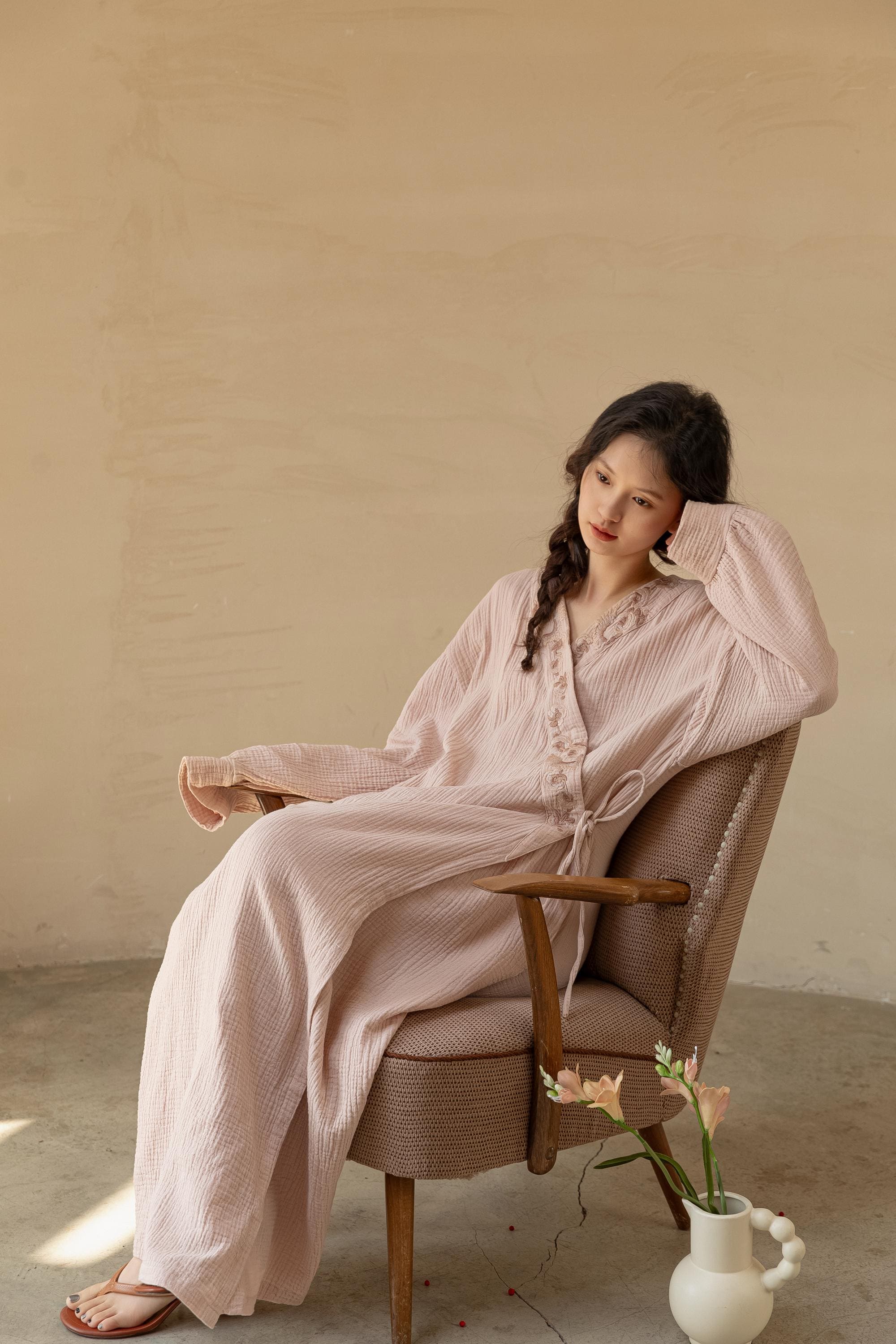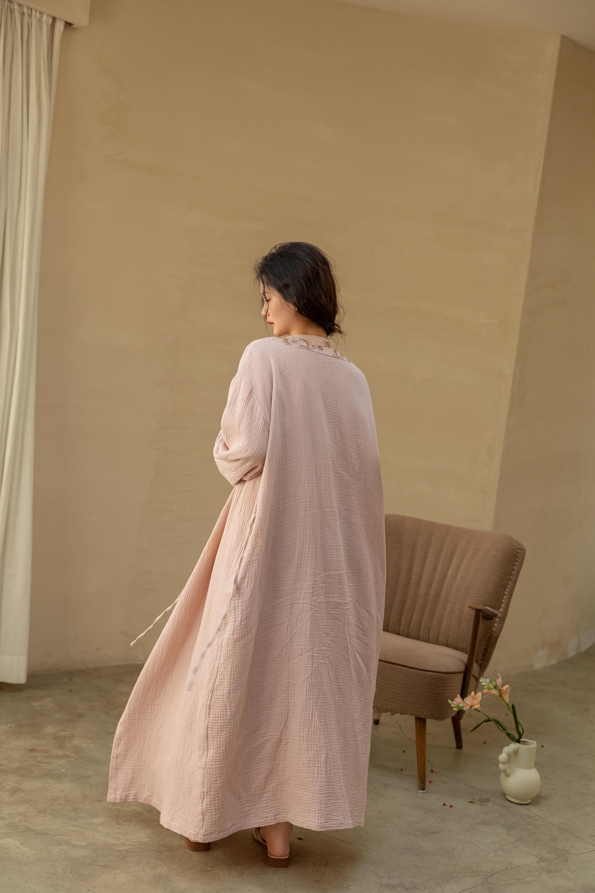 Part of our Gauze Cotton Series, this two-piece set is crafted from soft, breathable gauze cotton — a naturally cooling fabric ideal for all seasons. Known for its lightweight feel and skin-friendly texture, it’s perfect for those who seek comfort without sacrificing elegance.
