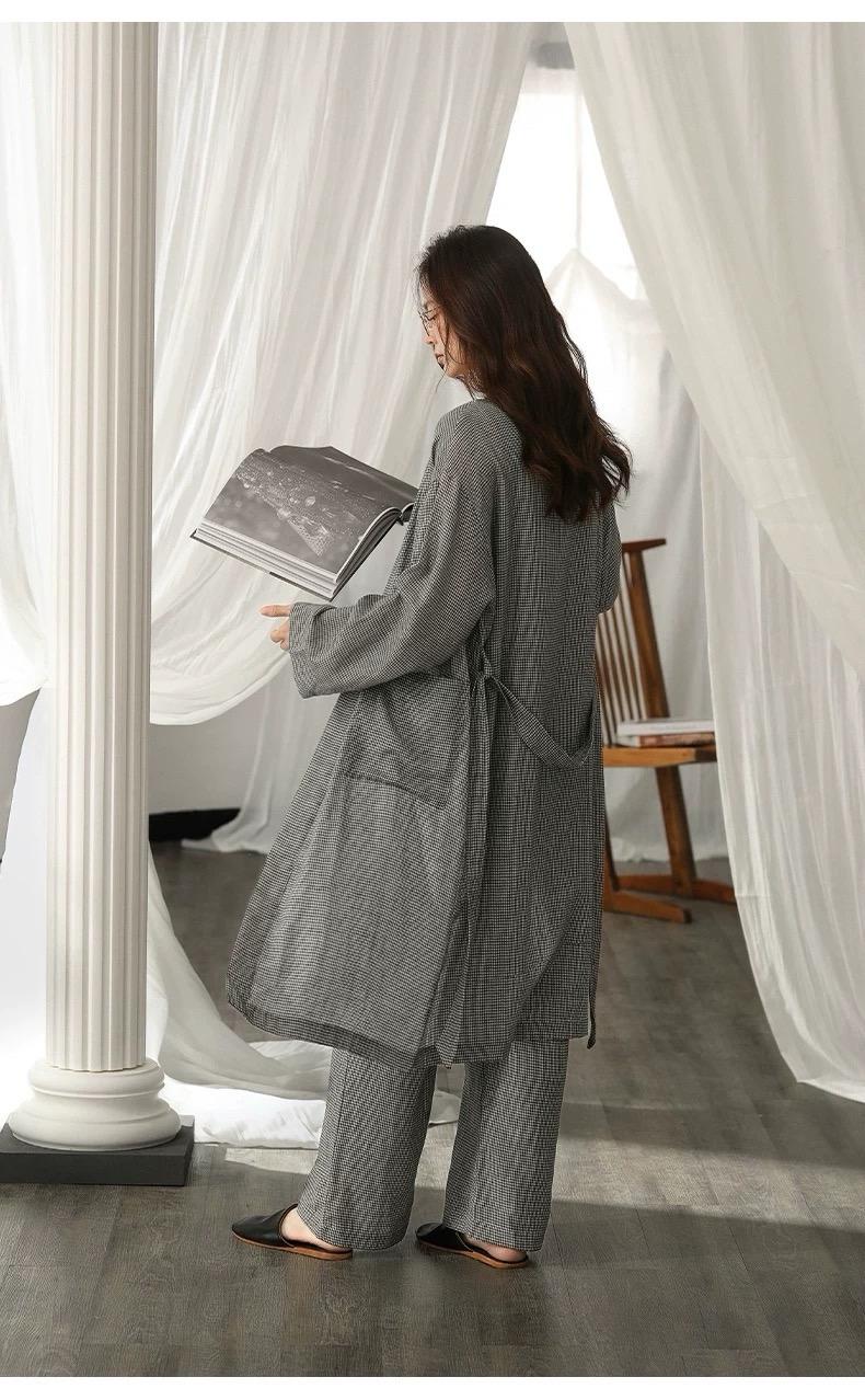 Crafted from 100% premium gauze cotton, this robe and pants set brings together minimalist charm and all-day comfort. The textured weave gives it a natural softness, perfect for sensitive skin. The robe features a wrap silhouette with a relaxed belt, paired with matching straight-leg cotton pants.
