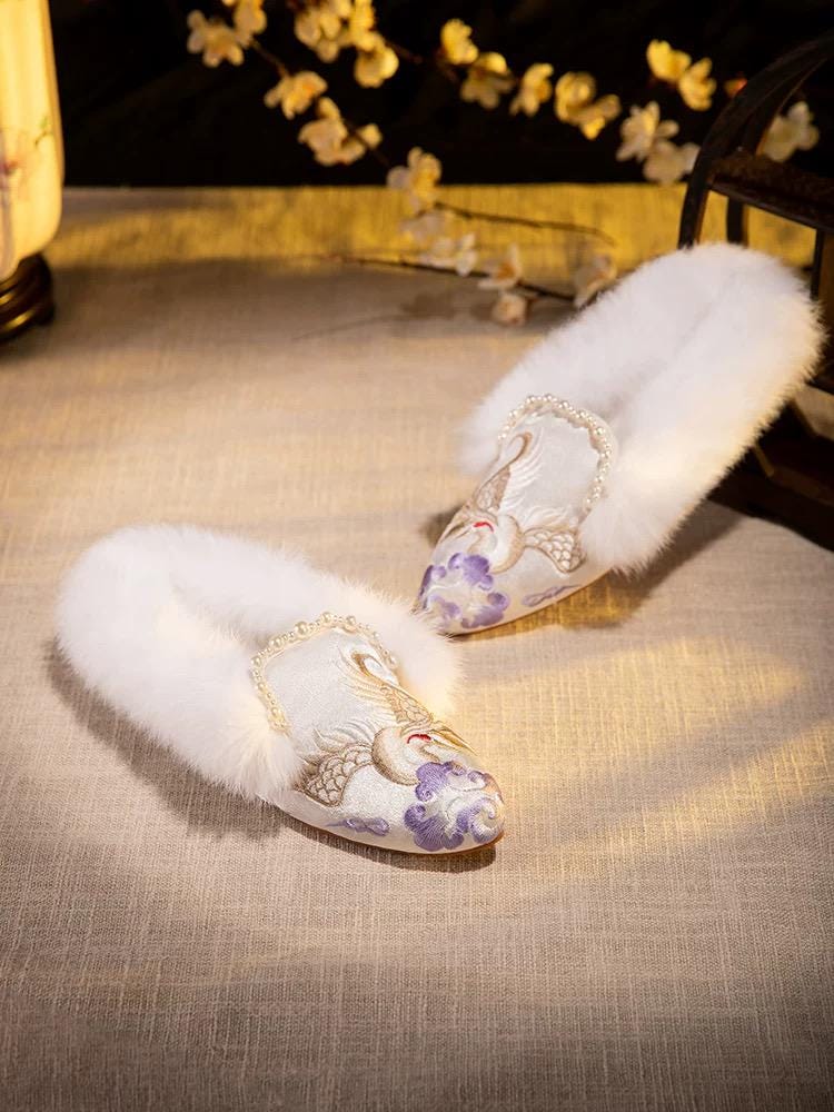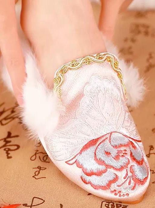 Handmade Embroidered Winter Slippers with Faux Fur Lining – Traditional Chinese Style, Warm & Comfortable Winter Mules, Perfect Gift for Her
