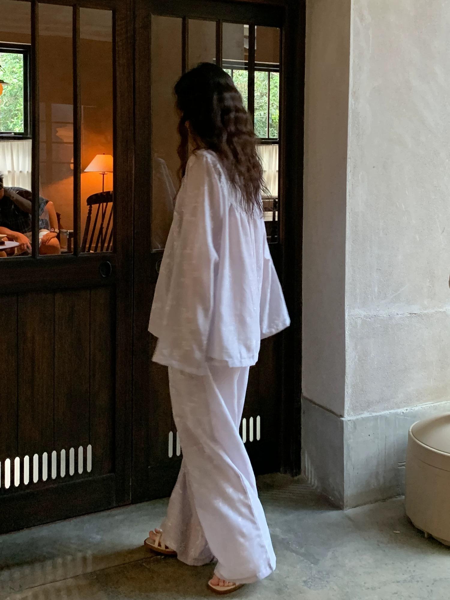 This very light purple (lilac/lavender) gauze cotton pajama set is designed for relaxed, loose comfort—perfect for winding down, lazy mornings, and lounge-to-street moments at home.