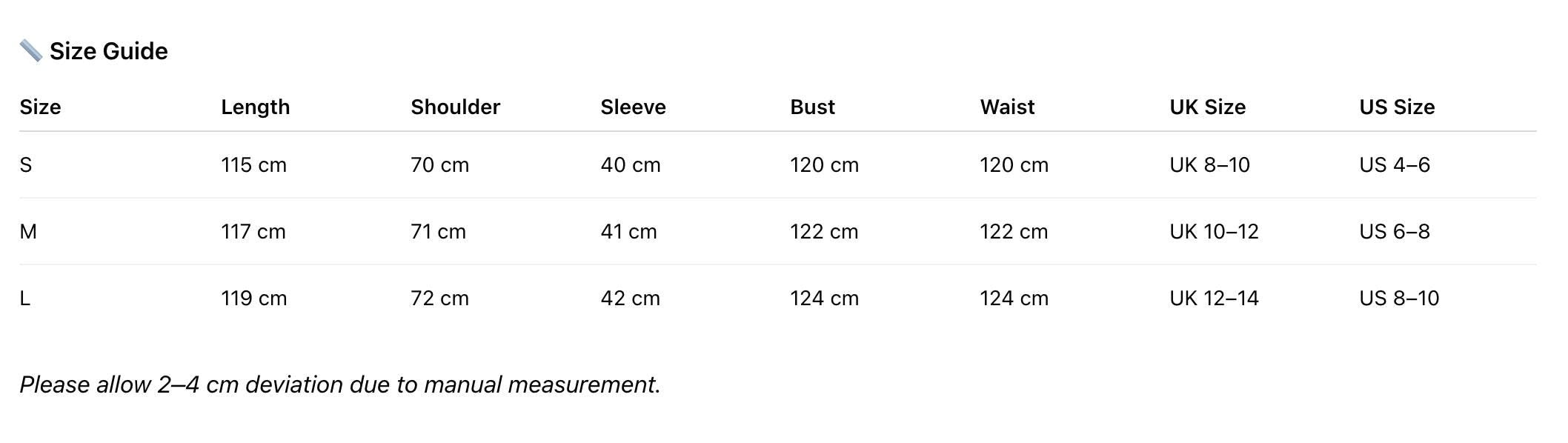 📏 Size Guide (in CM)