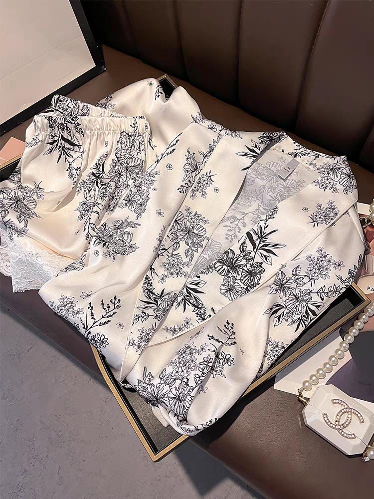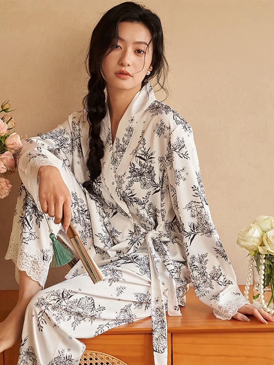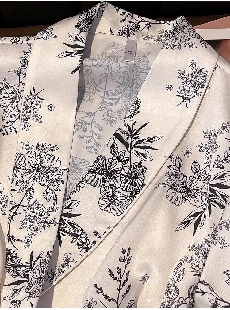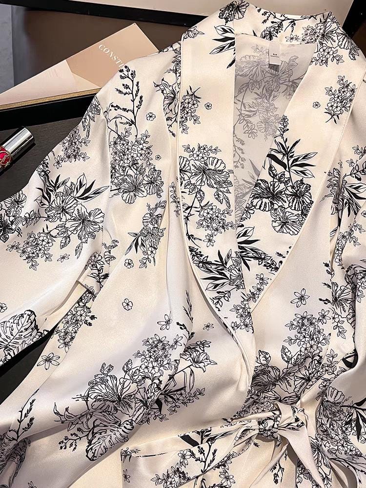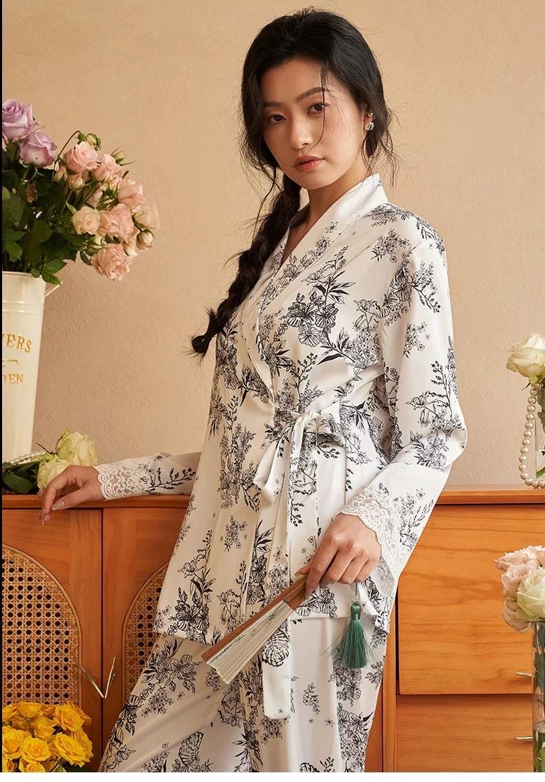🌸 Wrap yourself in luxury with our Oriental Style Silky Pajamas. This elegant women’s loungewear set features a delicate black-and-white floral design and is crafted from lightweight, silky fabric for ultimate comfort. The robe comes with a matching belt and feminine lace trim on the sleeves, making it ideal for lounging or a relaxing night's sleep.