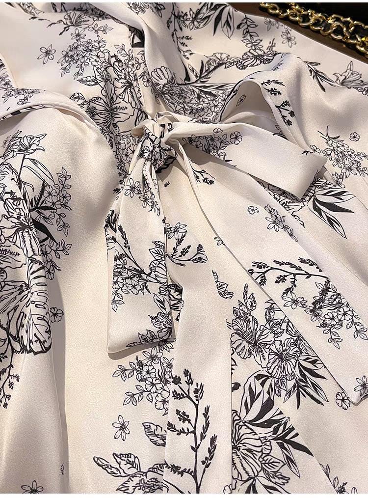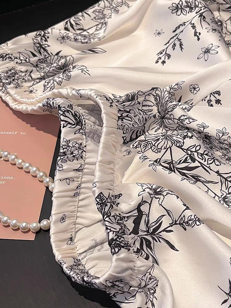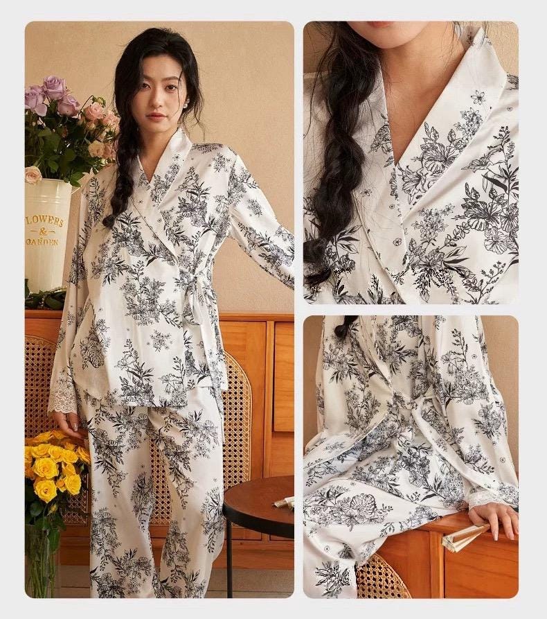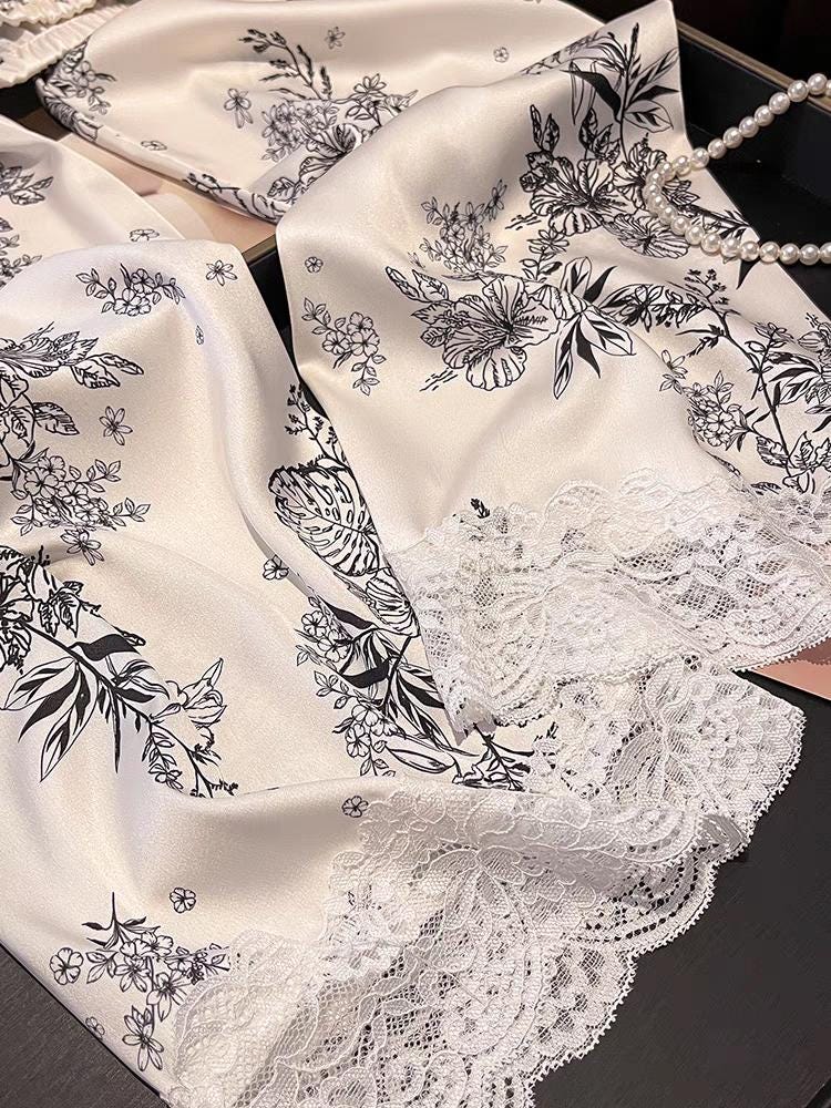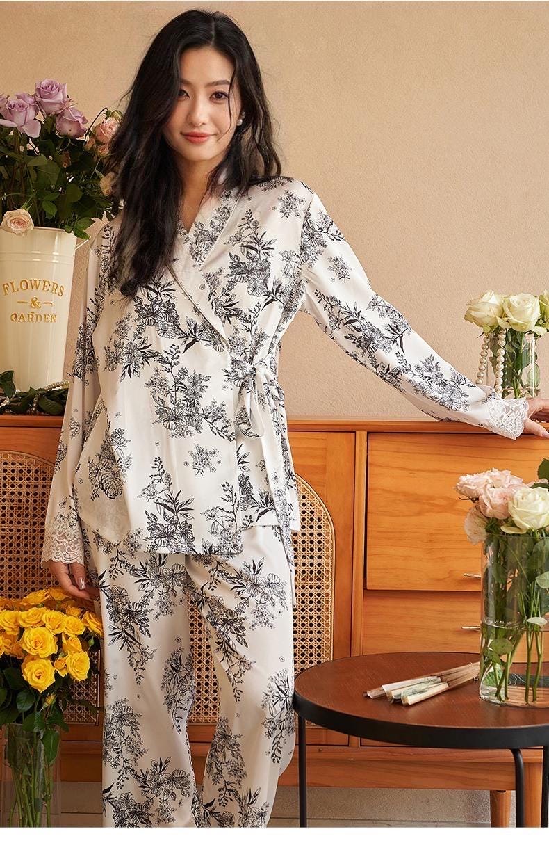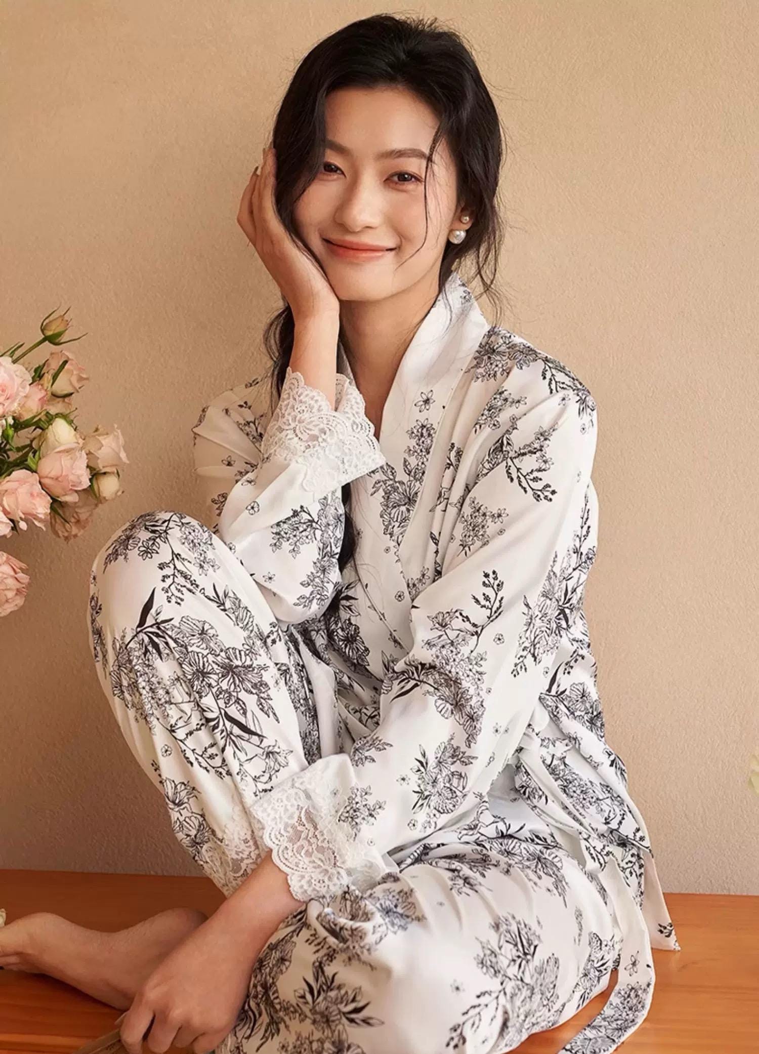 🌸 Wrap yourself in luxury with our Oriental Style Silky Pajamas. This elegant women’s loungewear set features a delicate black-and-white floral design and is crafted from lightweight, silky fabric for ultimate comfort. The robe comes with a matching belt and feminine lace trim on the sleeves, making it ideal for lounging or a relaxing night's sleep.