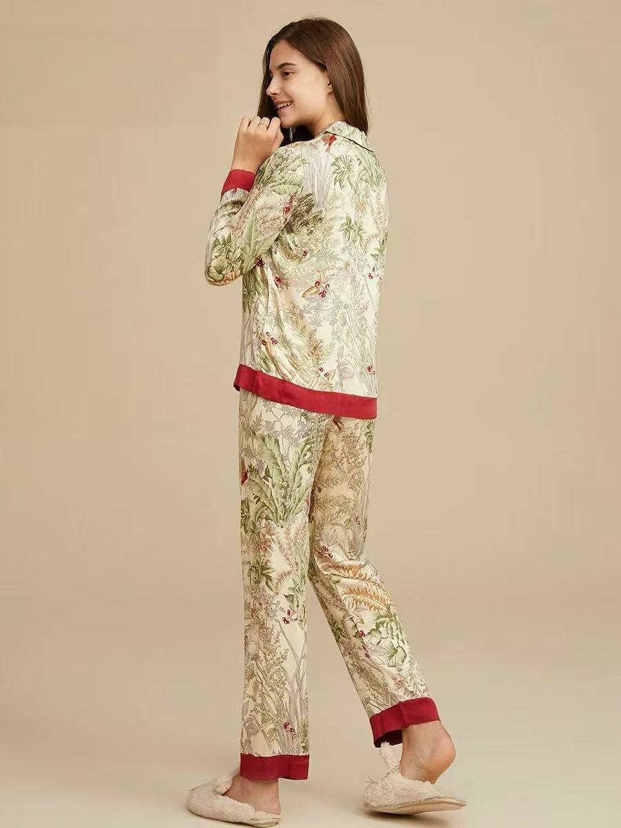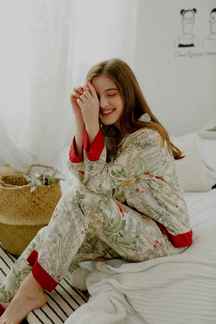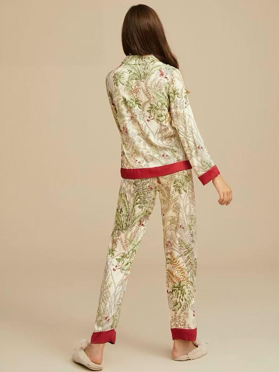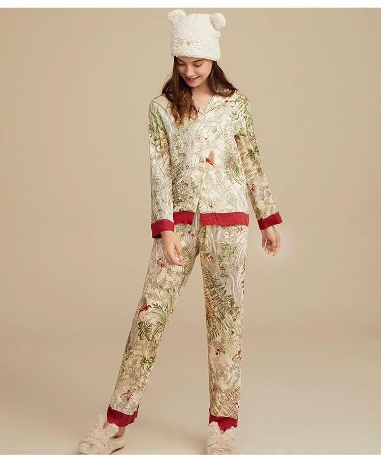 Floral Silk Blend Pajama Set: Luxury Long Sleeve Sleepwear, Red Trim, Christmas Pajamas in Gift Box