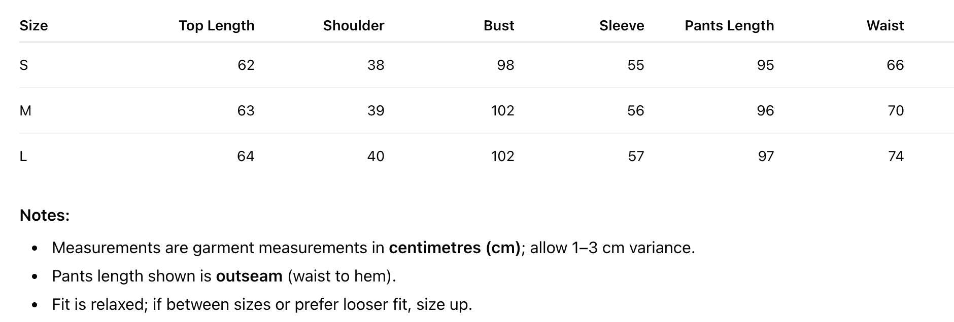Size S: Height 5'1" - 5'3", Weight 97 - 126 lbs.