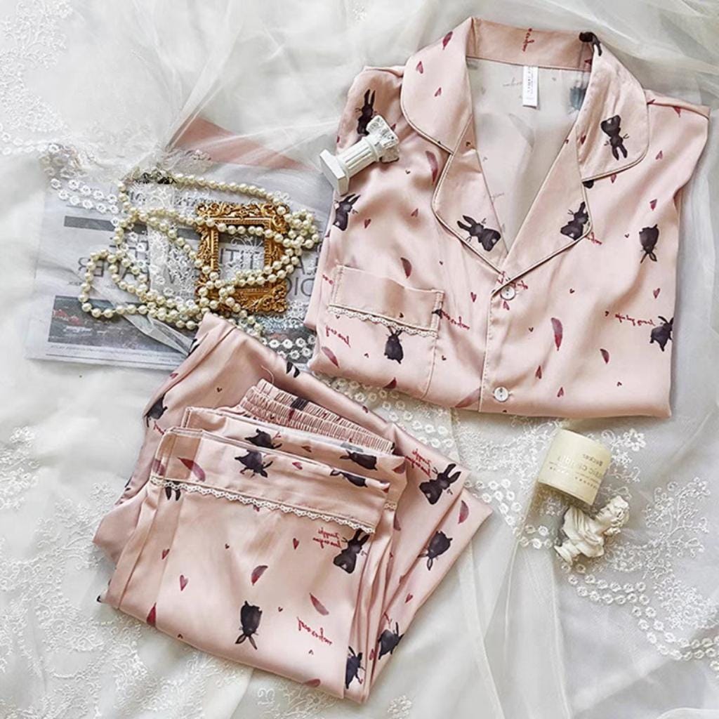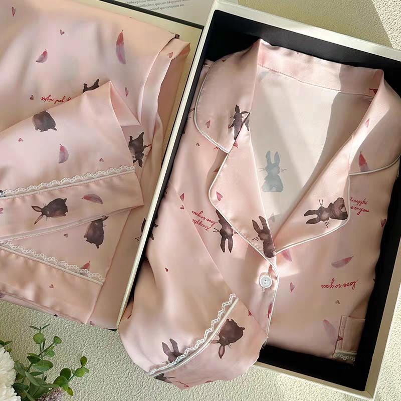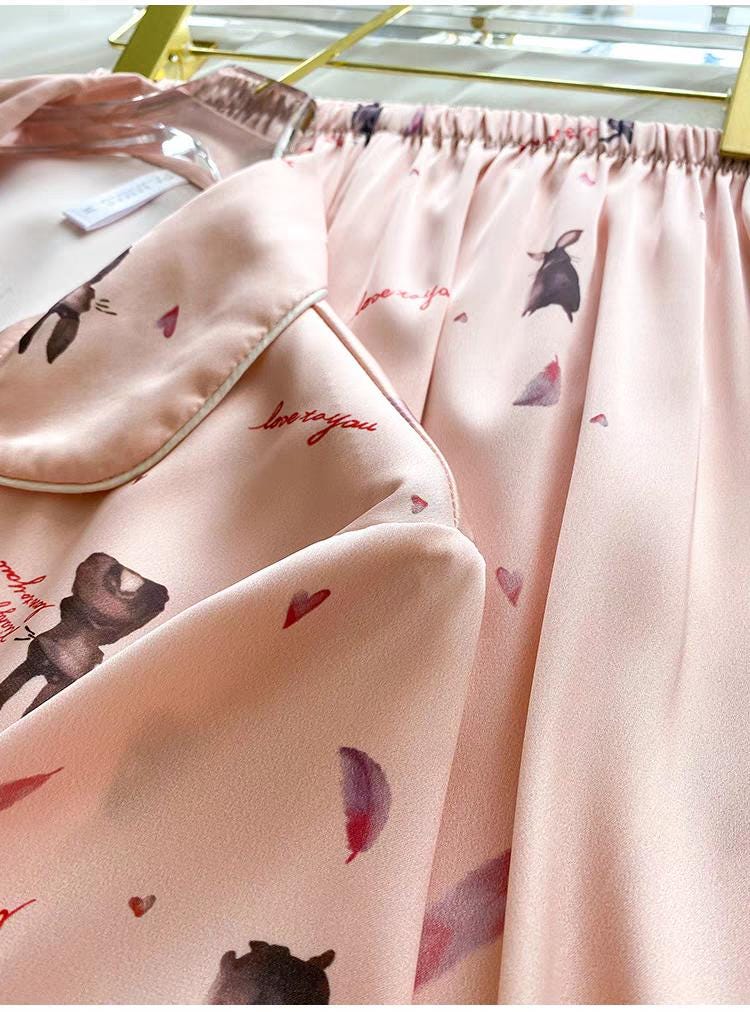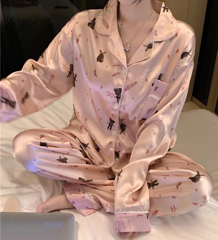 ๐ Pink Rabbit Silk Pyjamas: Long sleeve luxury silk lounge wear with a charming rabbit design, perfect for adding a touch of whimsy and elegance to your home wear.