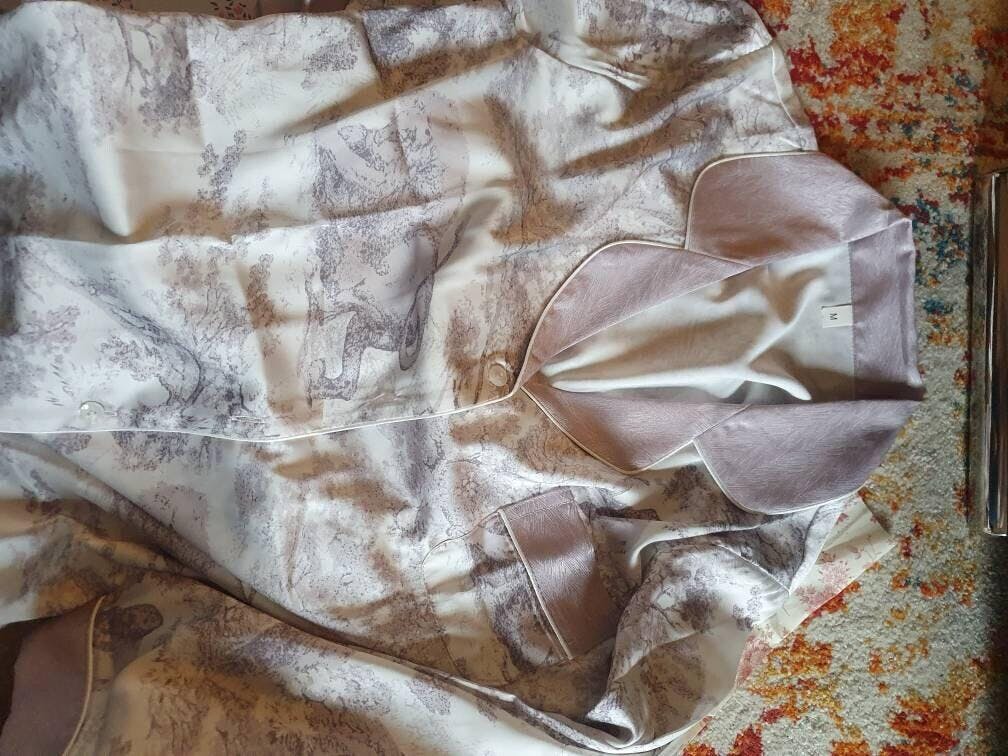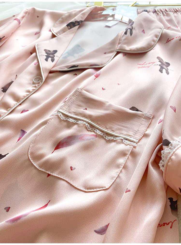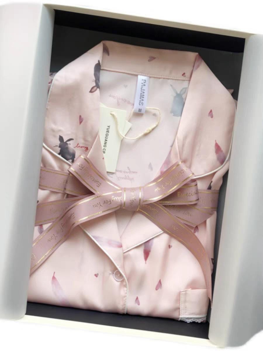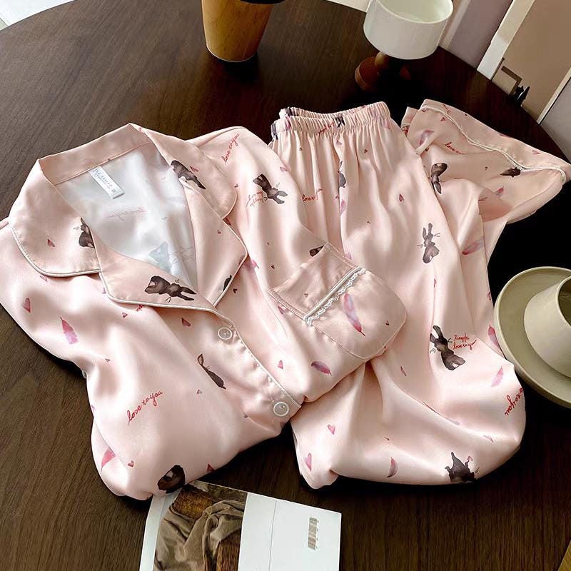 ๐ Pink Rabbit Silk Pyjamas: Long sleeve luxury silk lounge wear with a charming rabbit design, perfect for adding a touch of whimsy and elegance to your home wear.