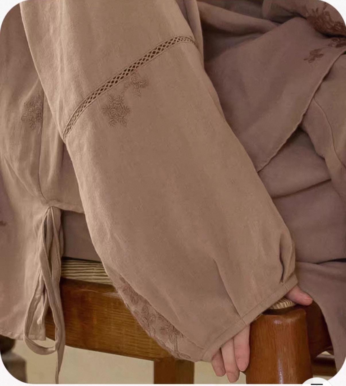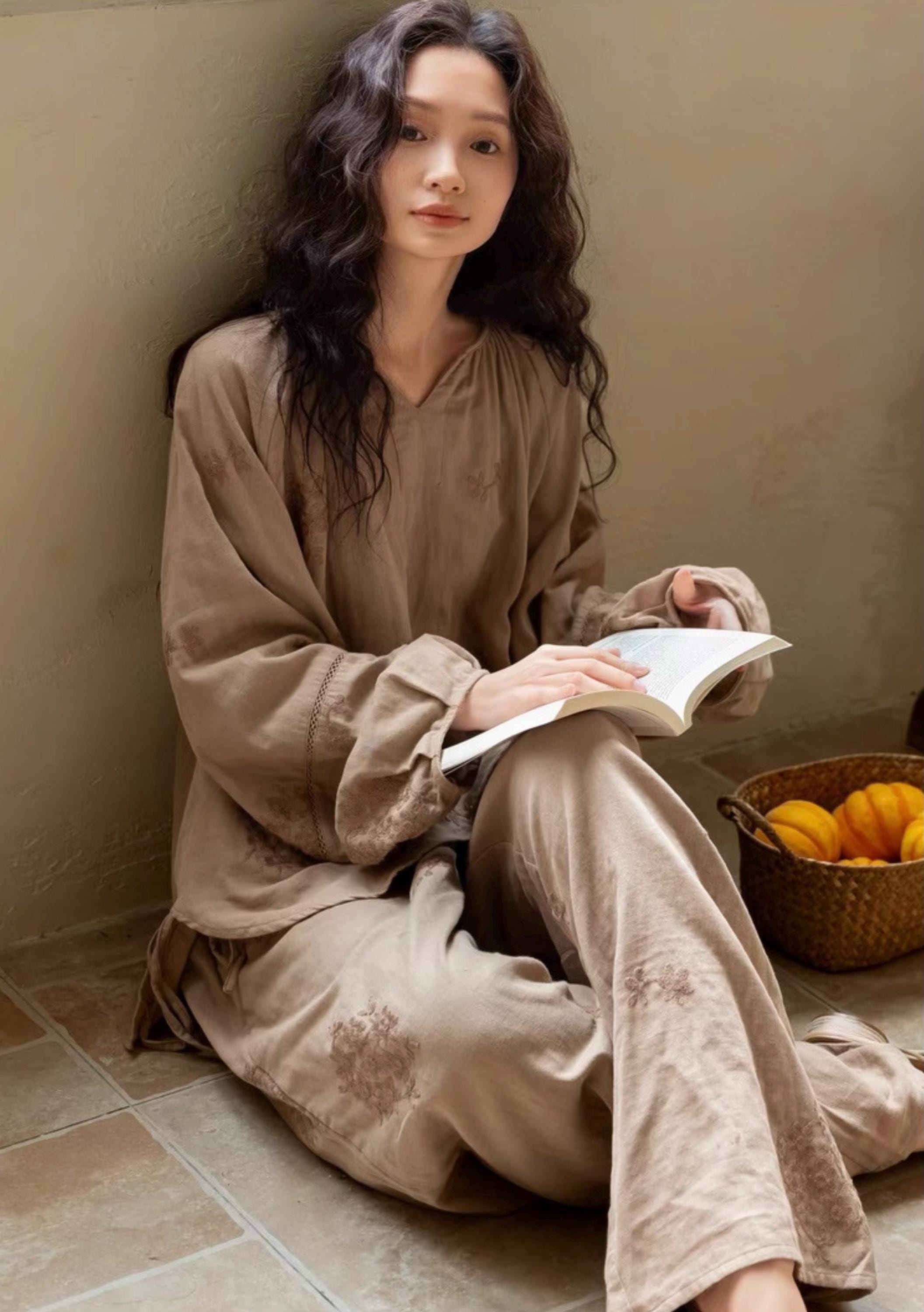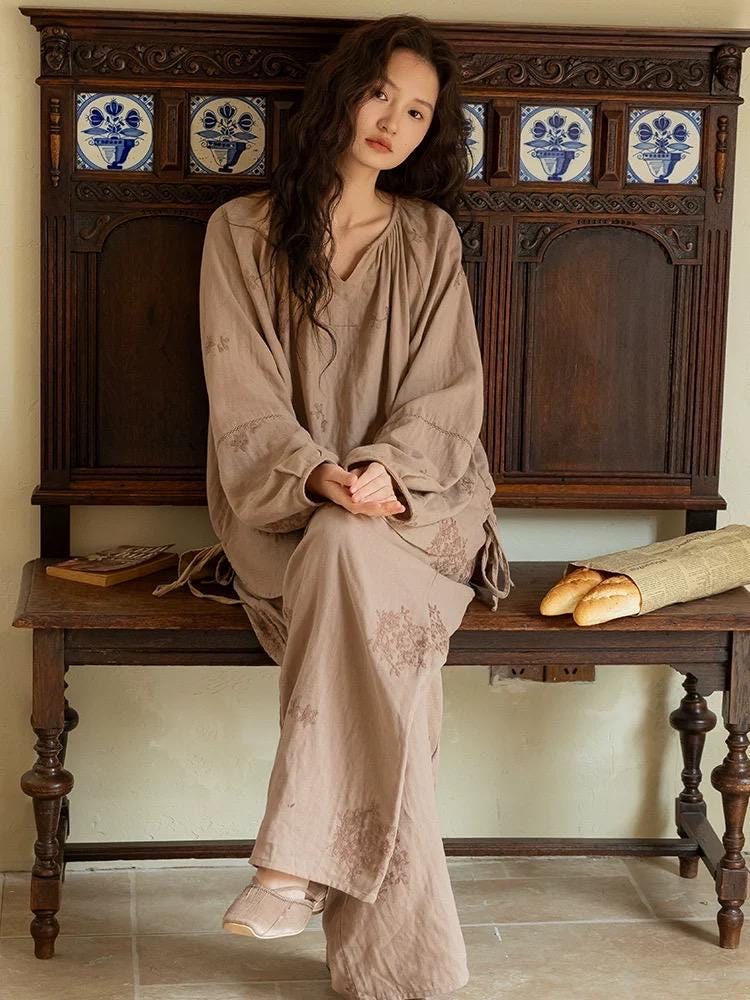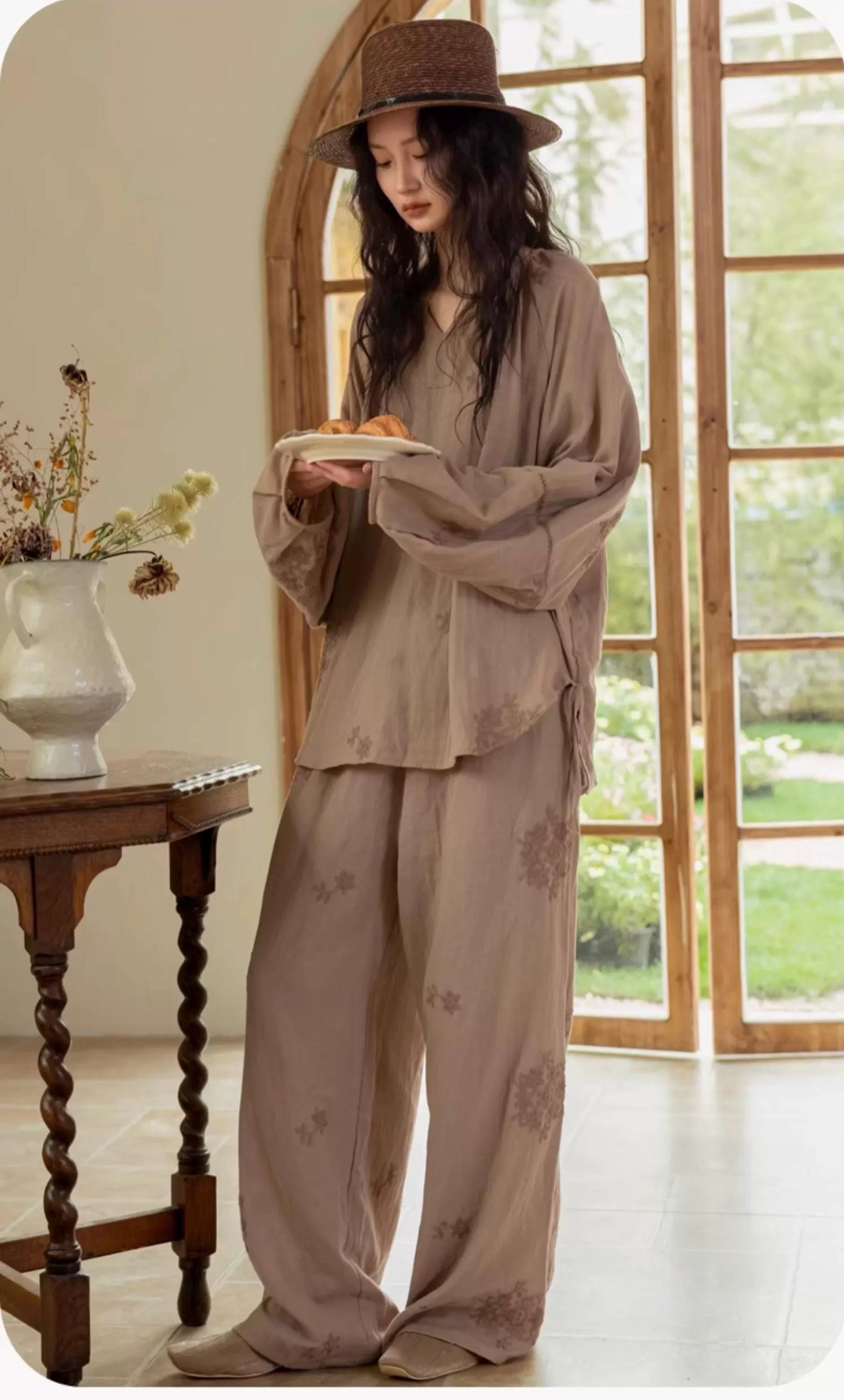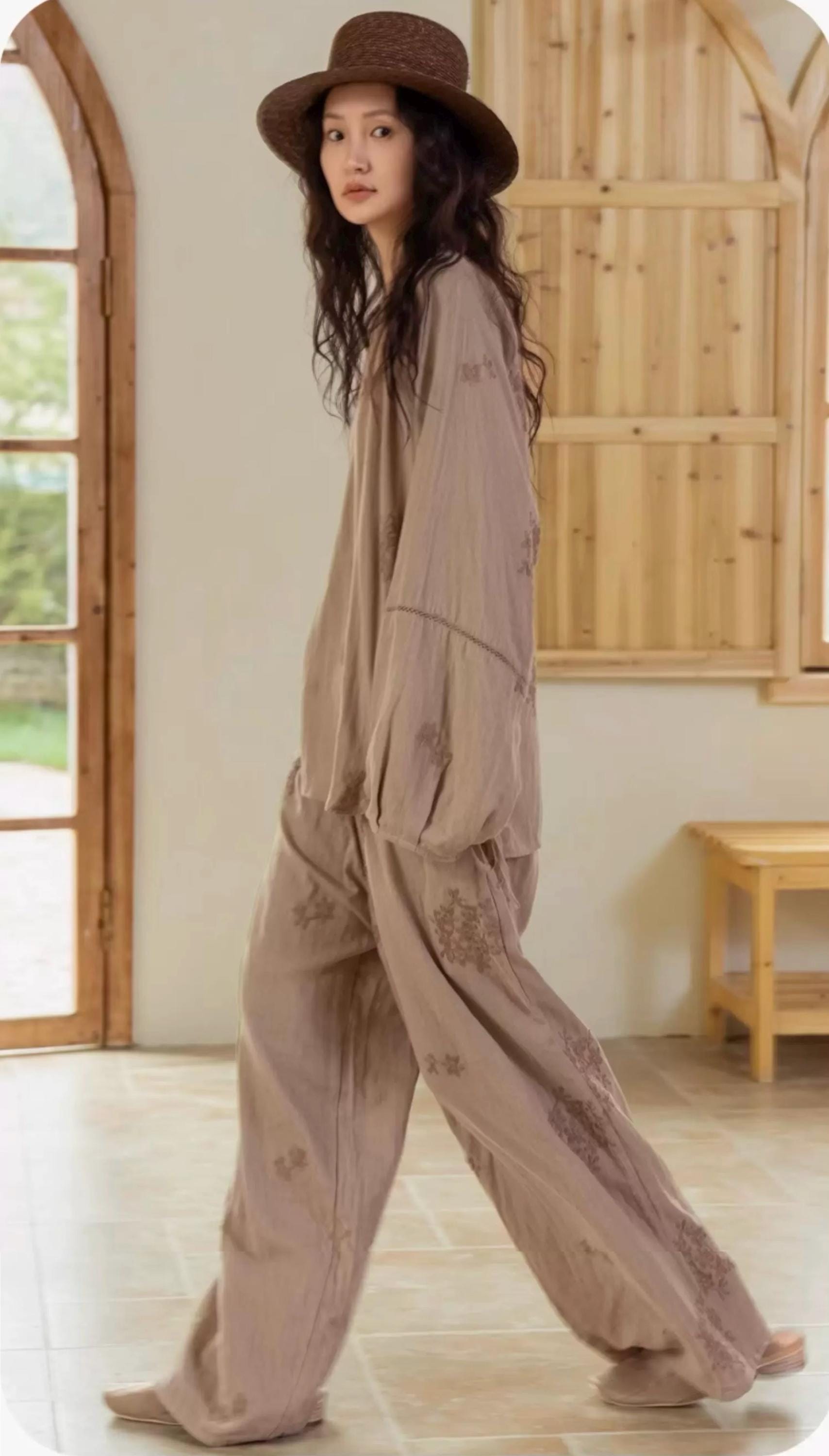 Designed with versatility in mind, this set features a loose, relaxed silhouette that flatters all body types. The embroidered top includes delicate botanical motifs that add an elegant touch to the casual look, while the wide-leg trousers offer flowing comfort with a subtle, structured drape. Natural neutral tones make it easy to pair with your existing wardrobe.