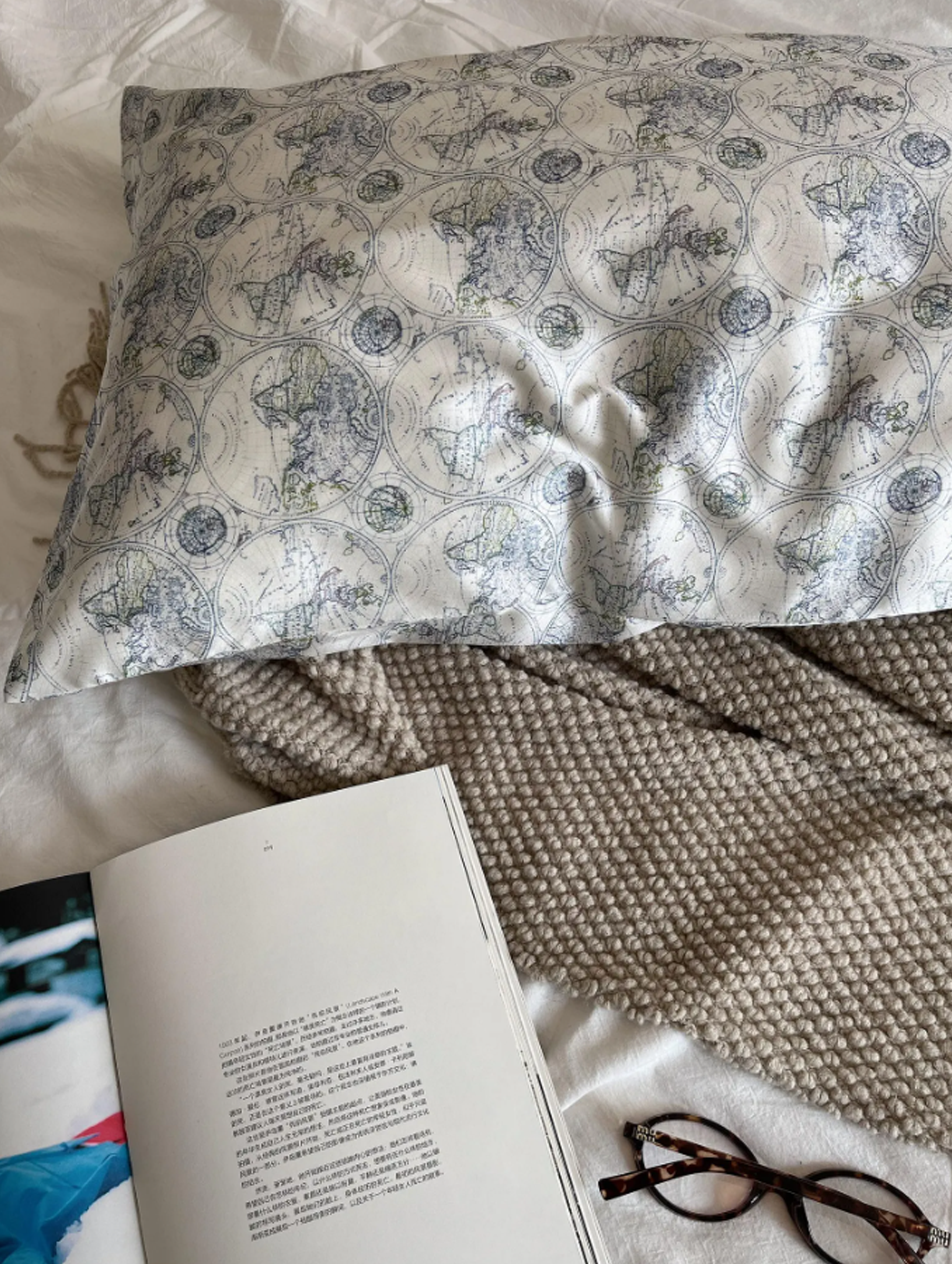 The vintage-style world map motif in muted greys and greens adds a thoughtful, curated detail to any room — perfect for travel lovers or refined home aesthetics.