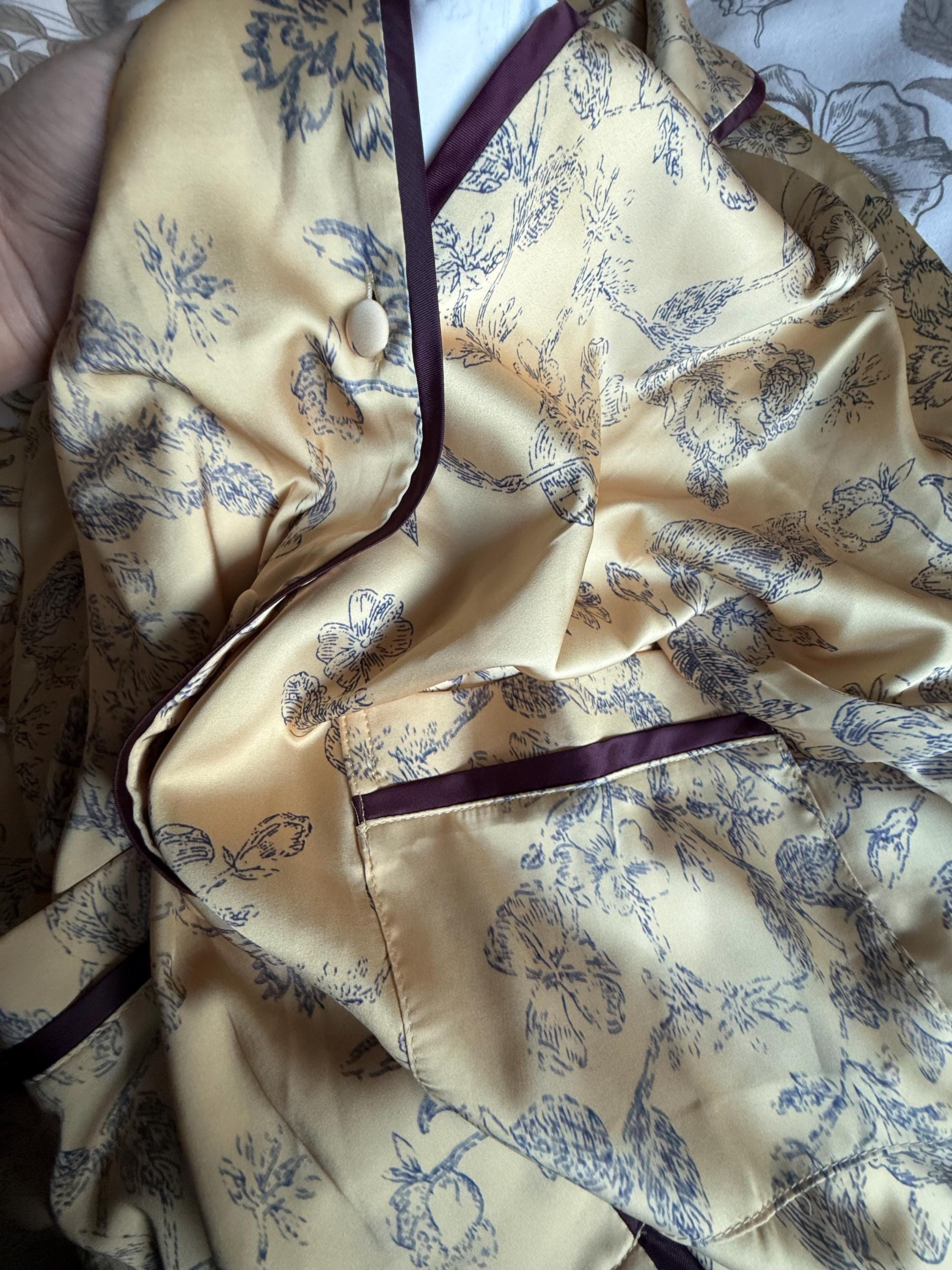 Experience timeless elegance with our luxurious Oriental Silky Pajamas in classic yellow. Crafted from a blend of silk and polyester, these pajamas combine comfort and style, featuring an enchanting oriental painting pattern that evokes a sense of heritage. The smooth texture feels divine against your skin, perfect for cozy evenings and indulgent nights. Designed with intricate detailing and an authentic aesthetic, these pajamas are ideal for those who appreciate unique, cultural designs.