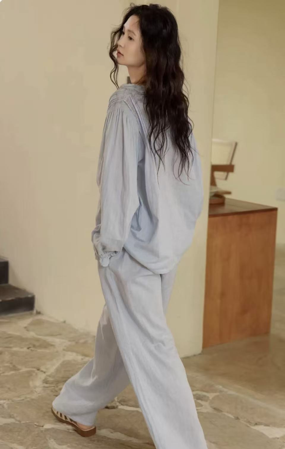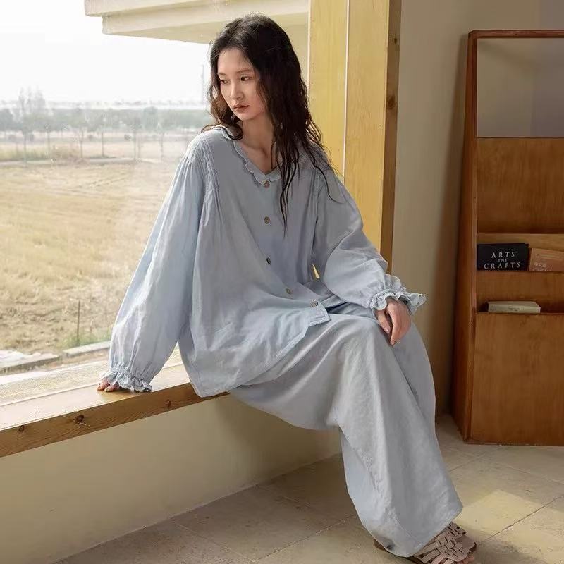 From Quiet Mornings to Laid-Back Evenings. This breezy loungewear set brings serenity to your wardrobe. Made from breathable gauze cotton, it features a soft, powder-blue hue that feels like a fresh morning sky. Choose between two elegant styles—each crafted for relaxed movement and effortless grace.